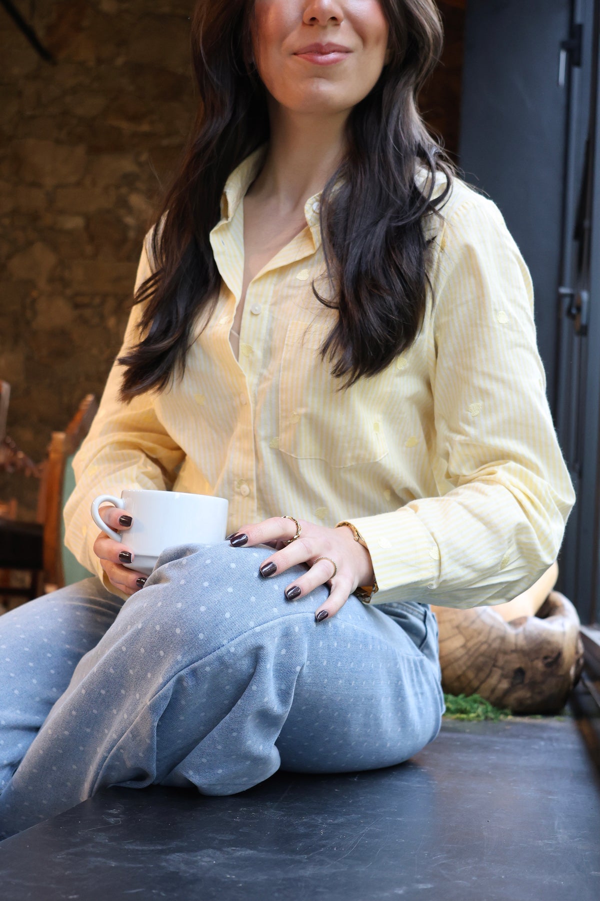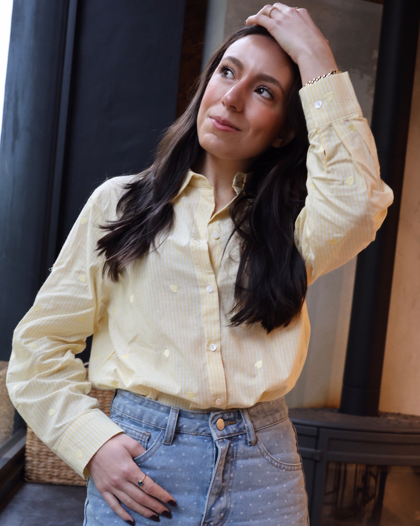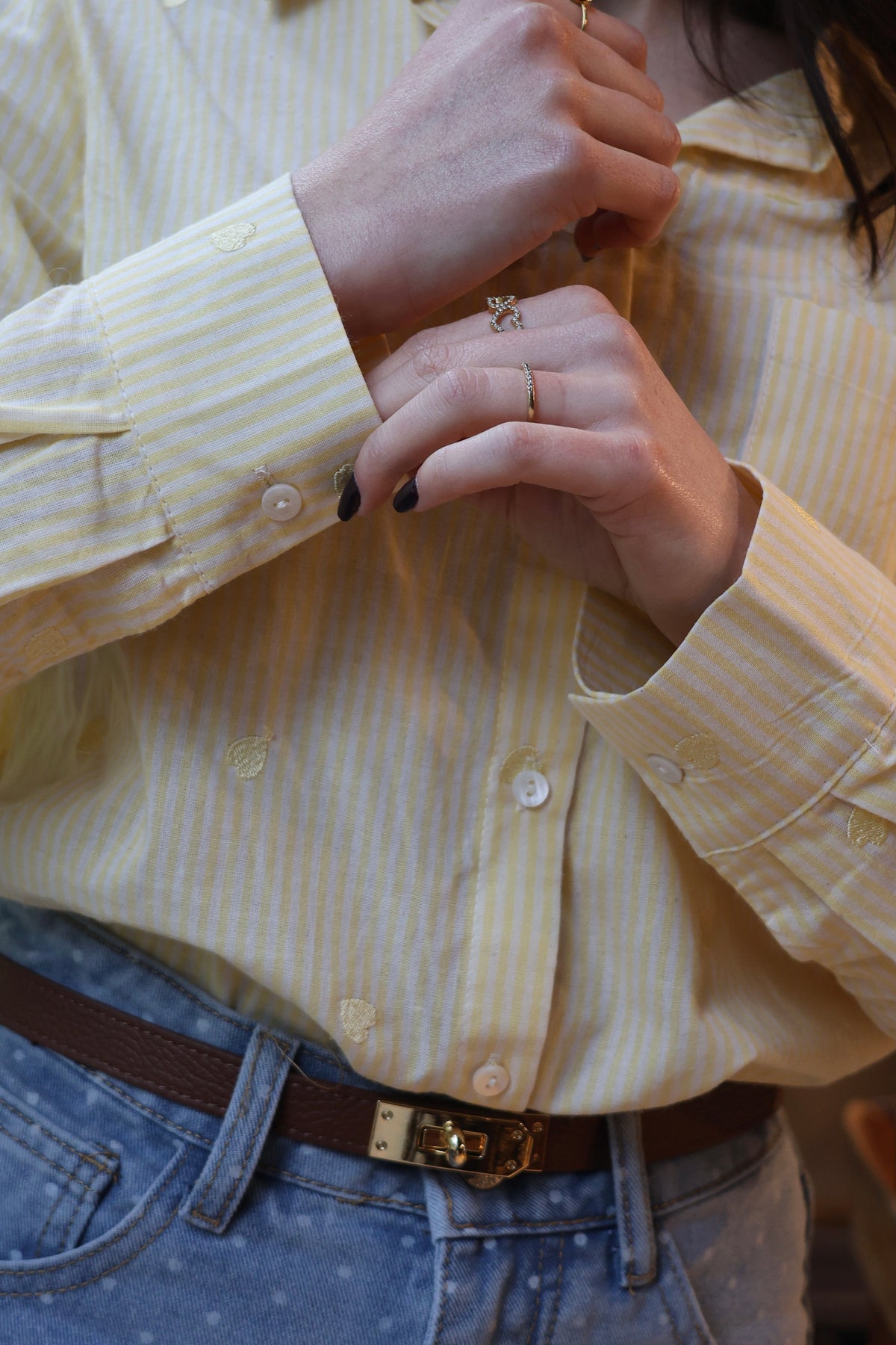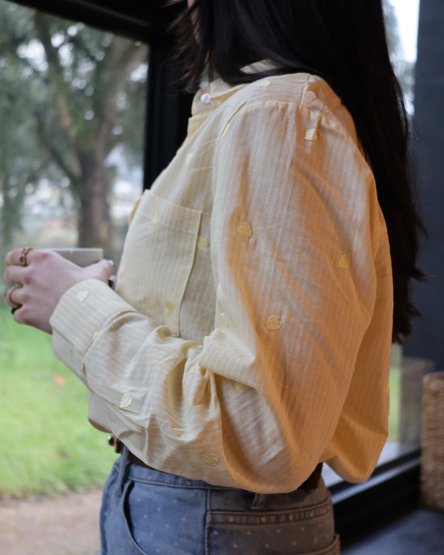 Camisa de manga comprida, em algodão, com listas brancas e corações amarelos bordados, Nova Coleção Spring26.