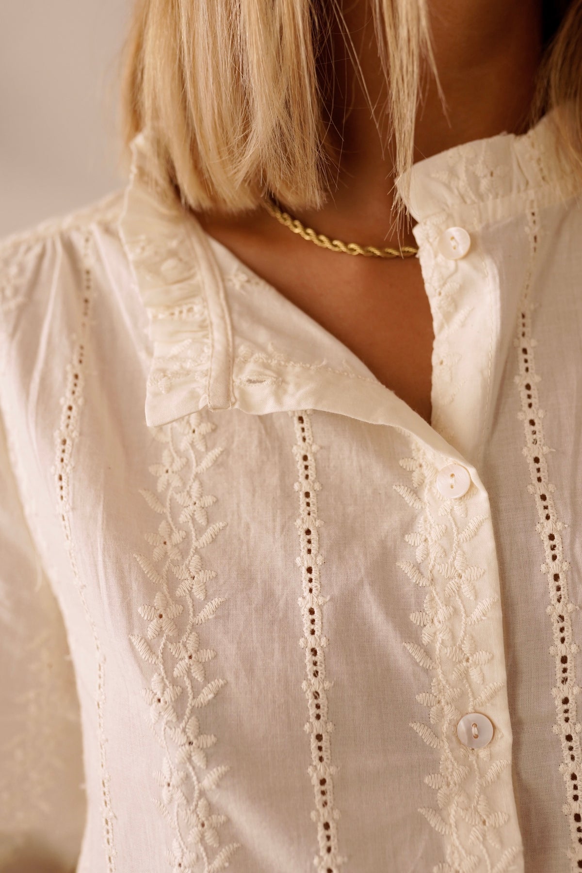 Blusa em algodão com bordados e gola romântica. Coleção Fall - Winter 2025.