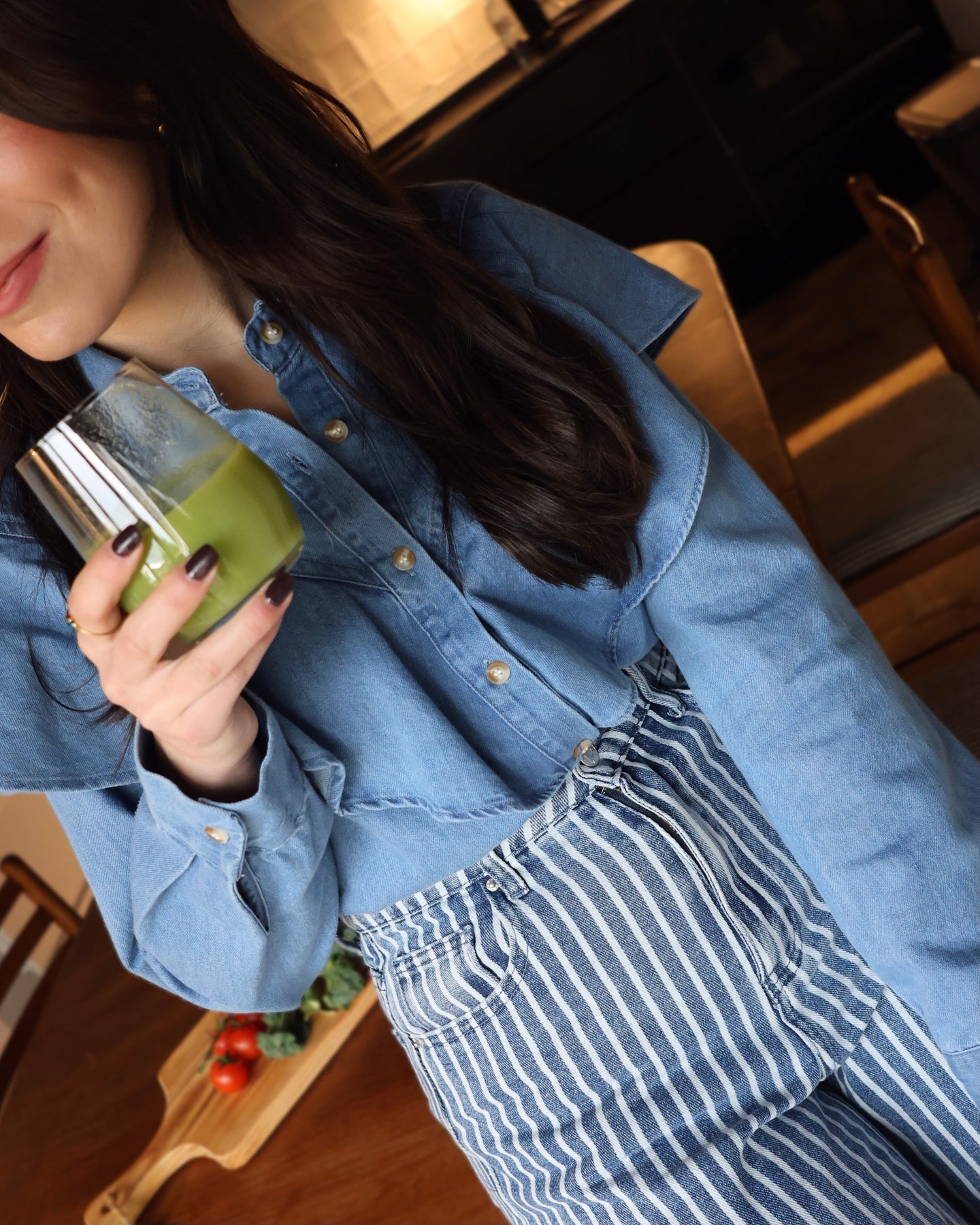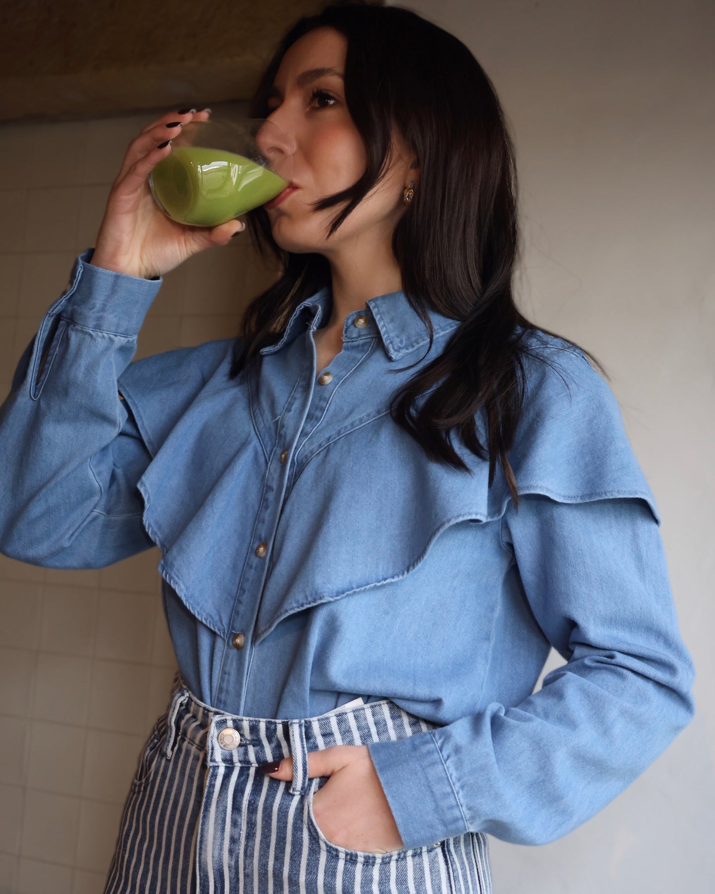 Camisa em ganga com folho muito linda para a nova estação, Nova Coleção Spring26.