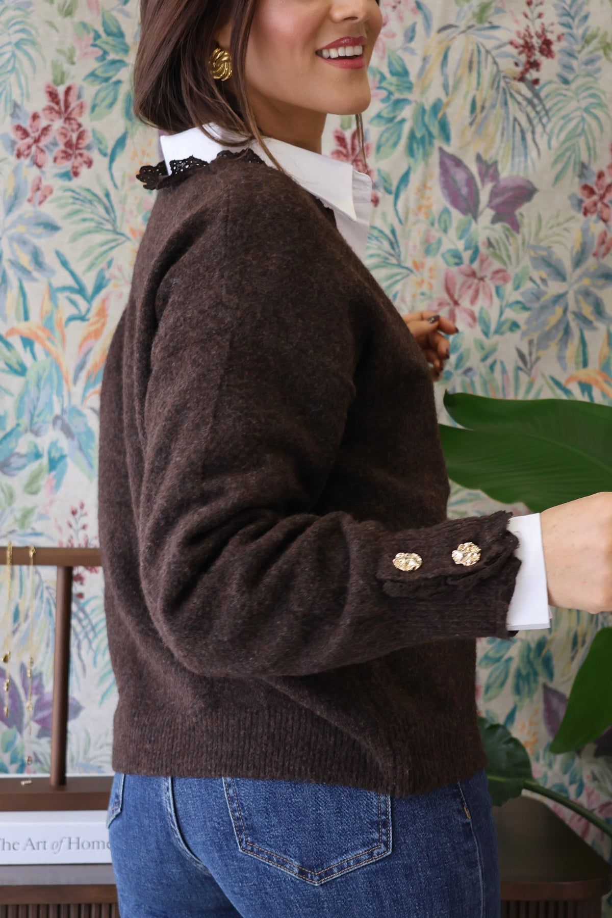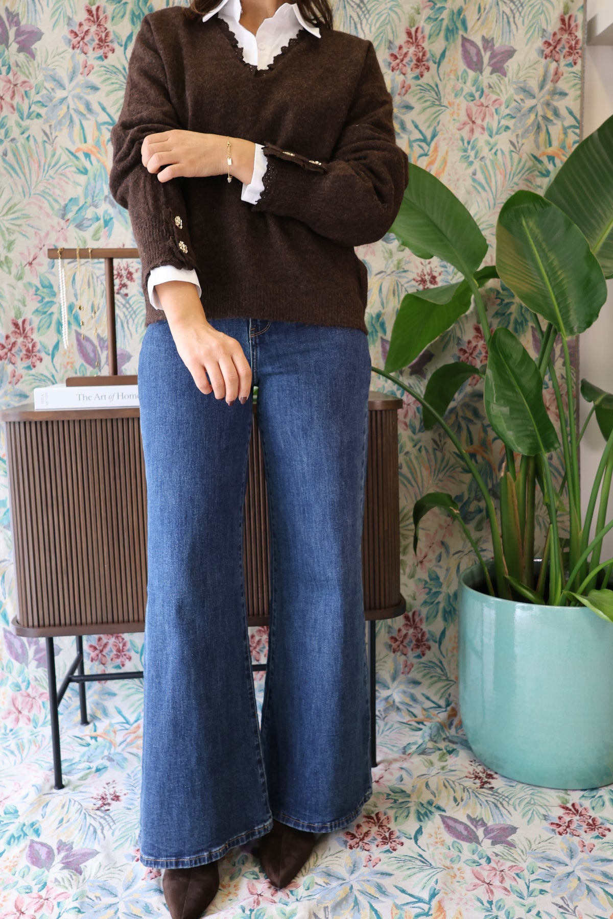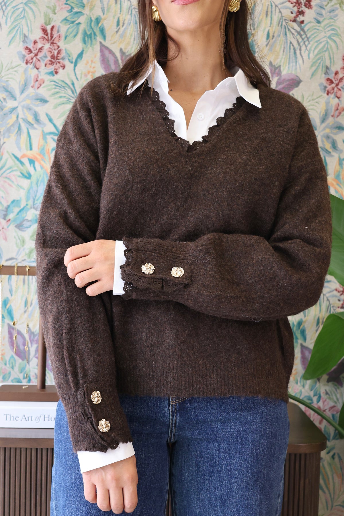 Camisola com detalhe em renda manga comprida decote em bico. Nova Coleção Fall - Winter 25.