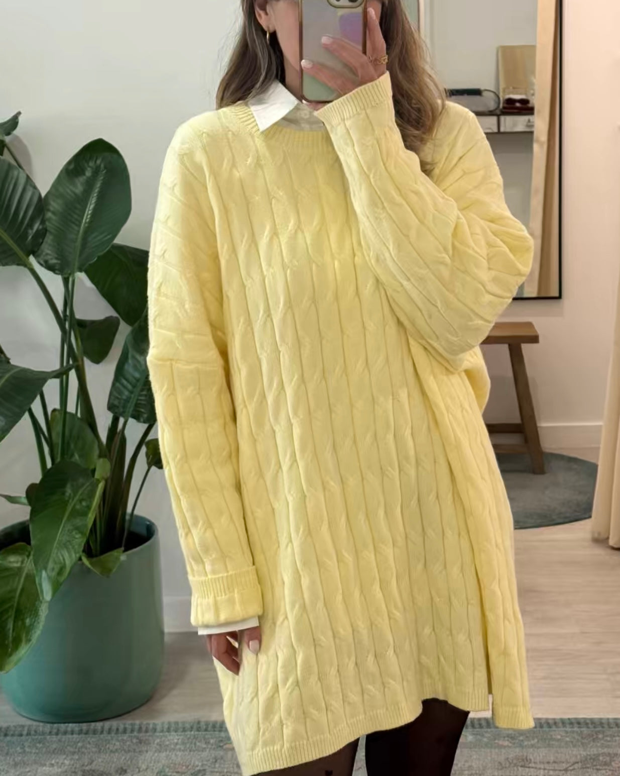 Vestido de malha entrançada, gola redonda e corte oversize, Nova coleção Spring26.