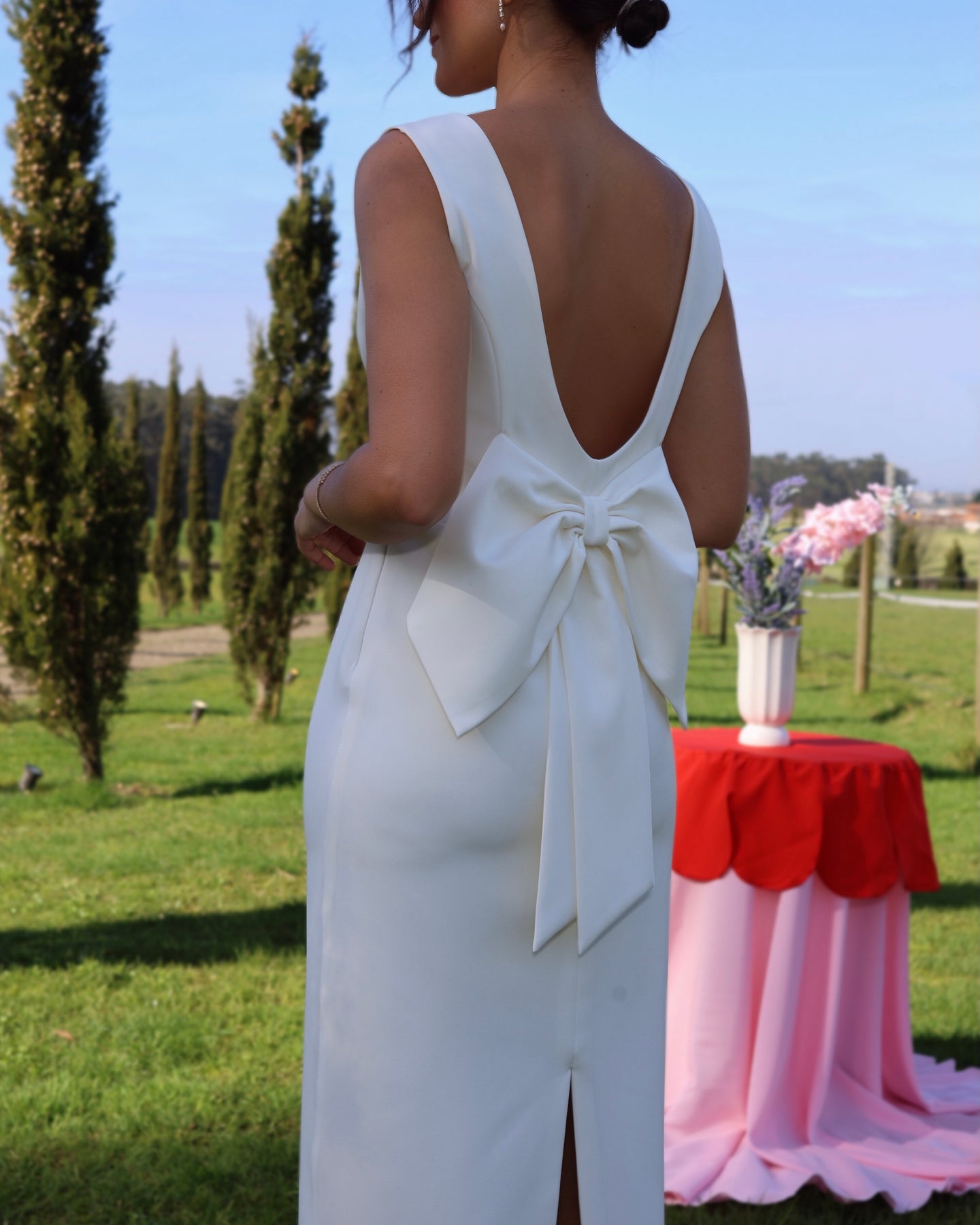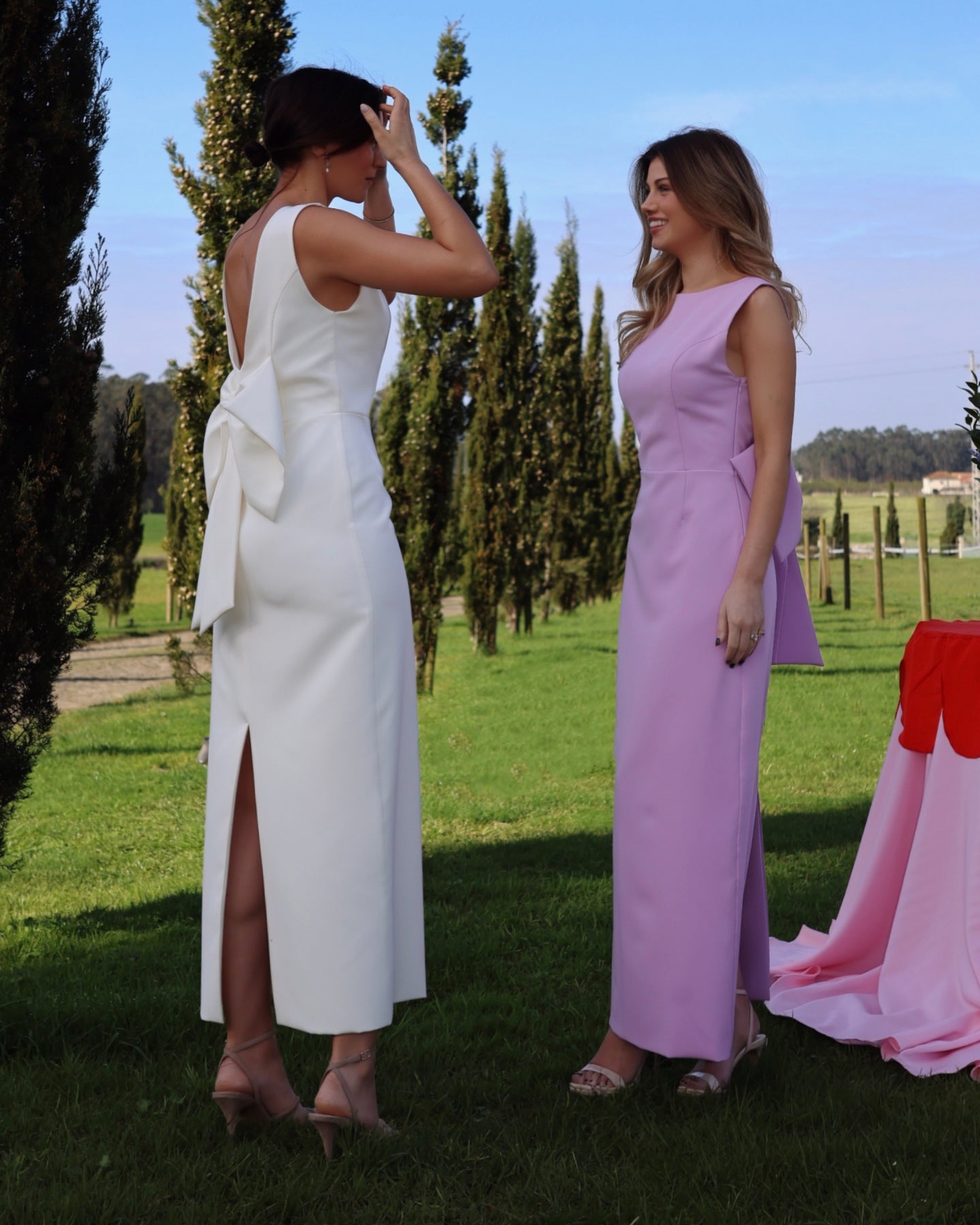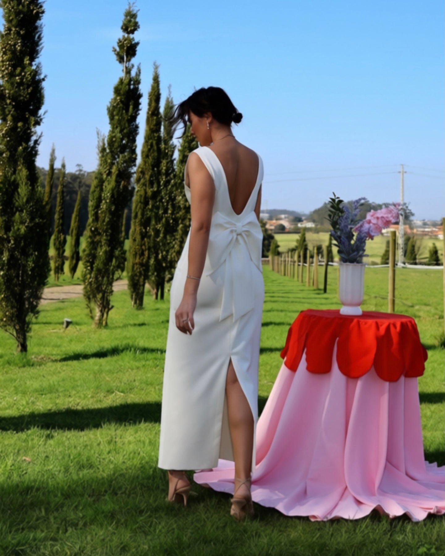 Vestido midi max sem mangas, costas abertas com laço, saia a corte a direito com racha atrás, um design feminino p, romântico perfeito para cerimoniais, batizados e casamentos.
