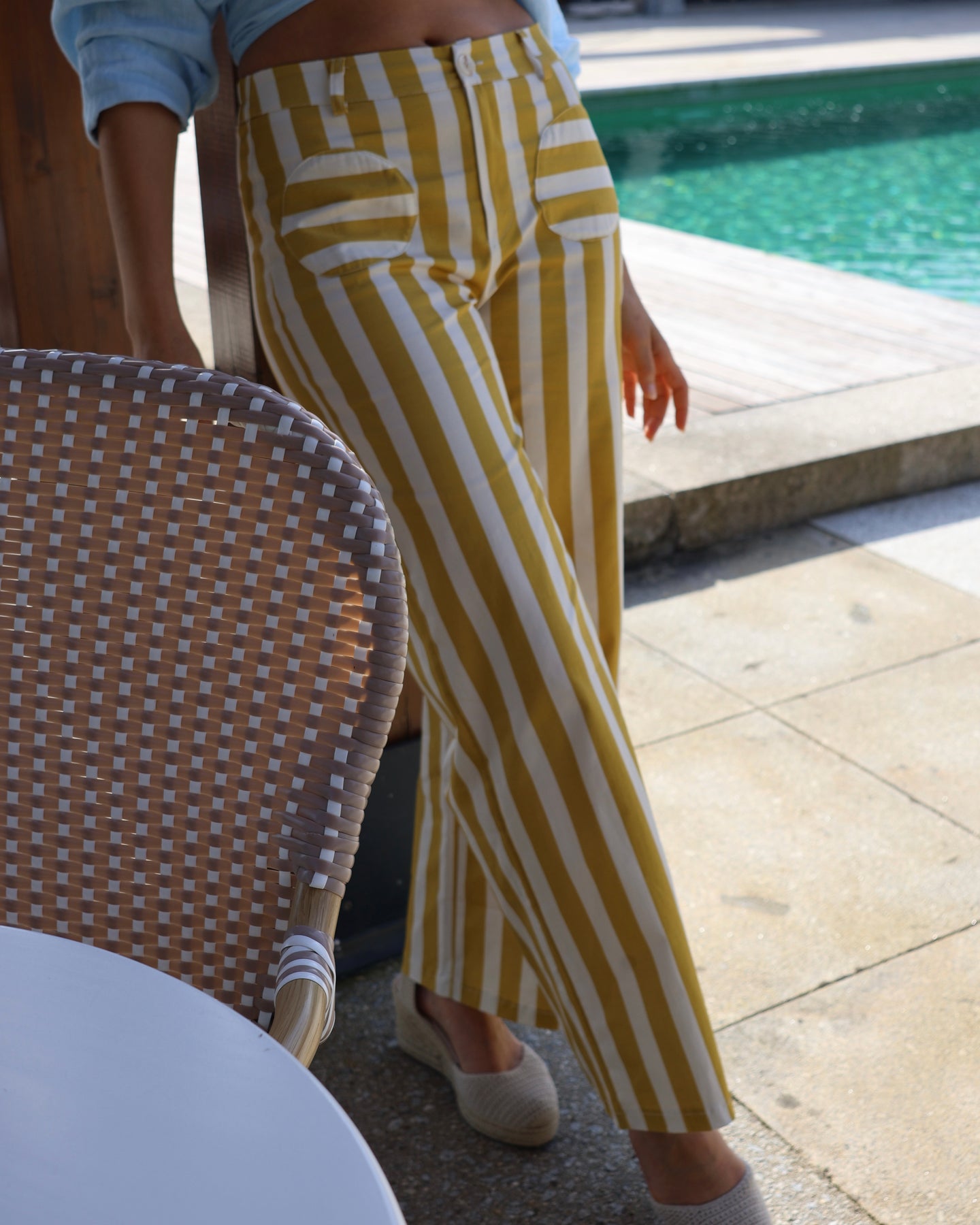Jeans tecido estilo sarja estampado com risca brancas e amarelas, cintura subida. Coleção Primavera 2026.