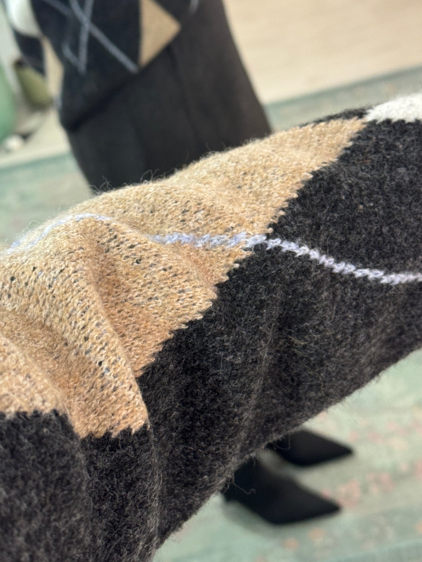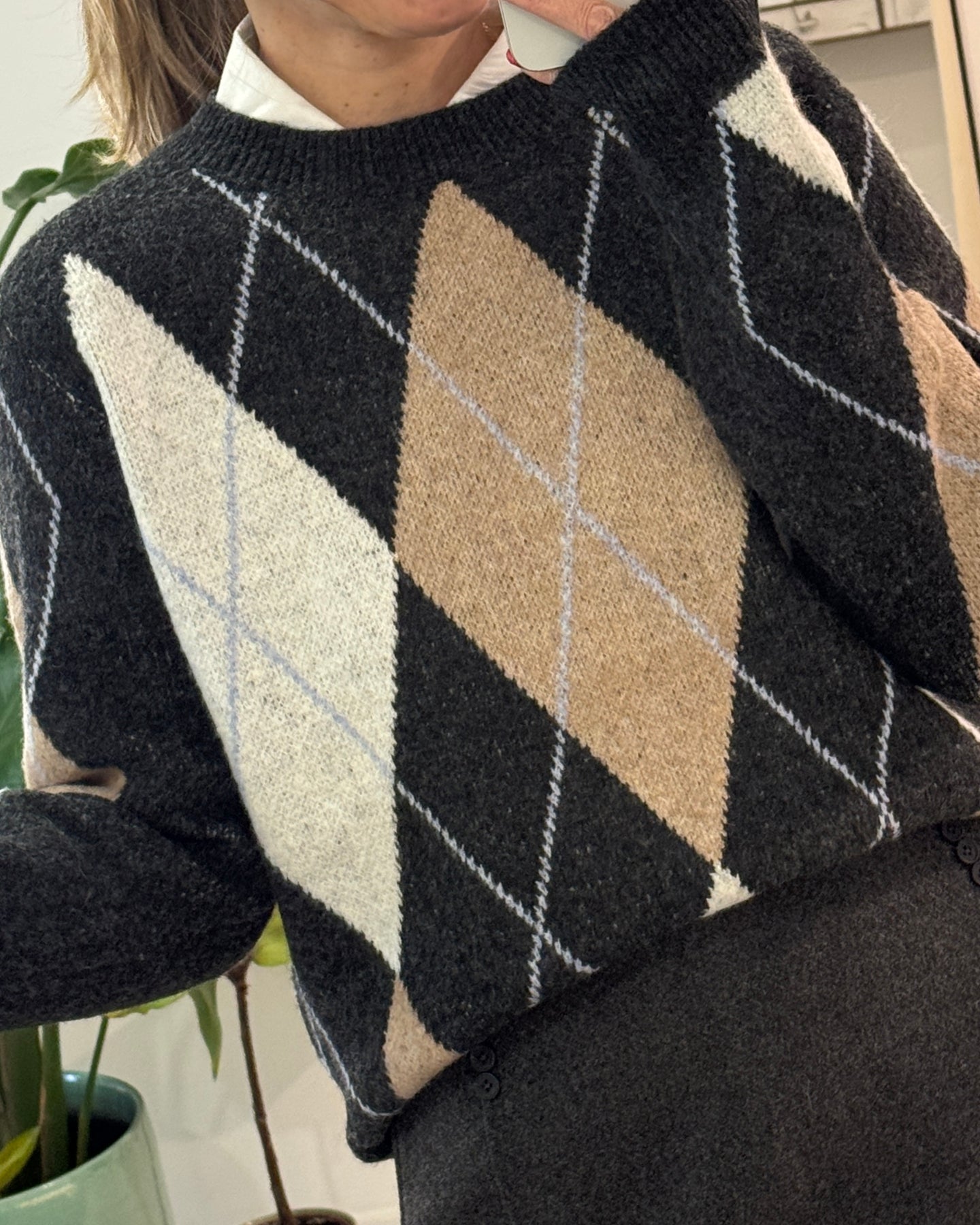 Descrição do produto. Camisola composta por lã, em malha, padrão losango, manga comprida, Coleção Fall-Winter25.