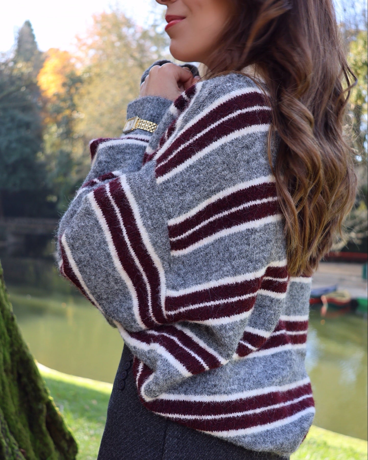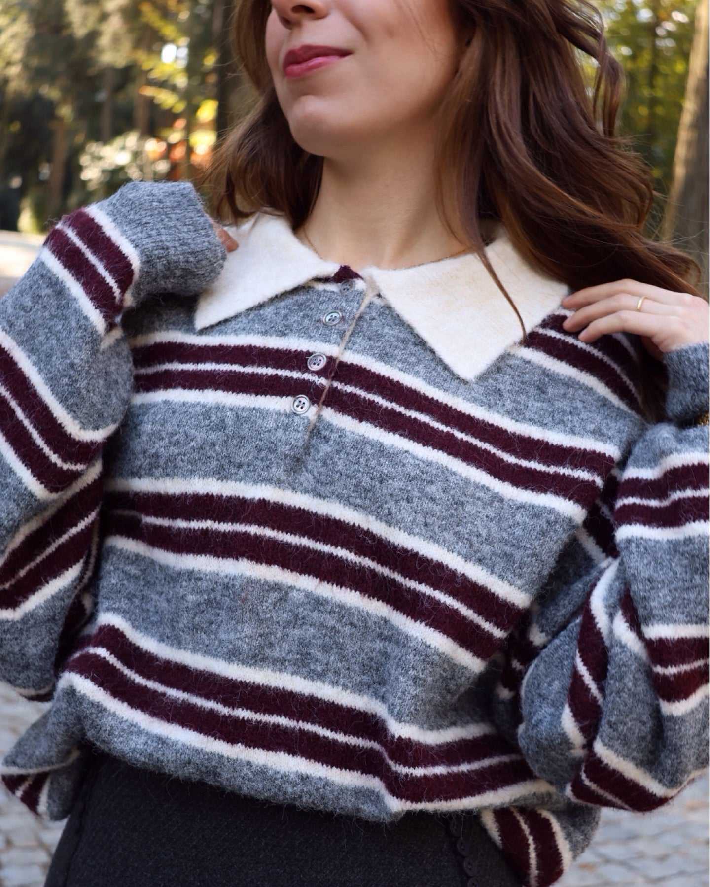 Descrição do produto. Camisola gola estilo polo, manga comprida, com listas de diferentes tamanhos, composta por lã, estilo polo, Coleção Fall-Winter25.