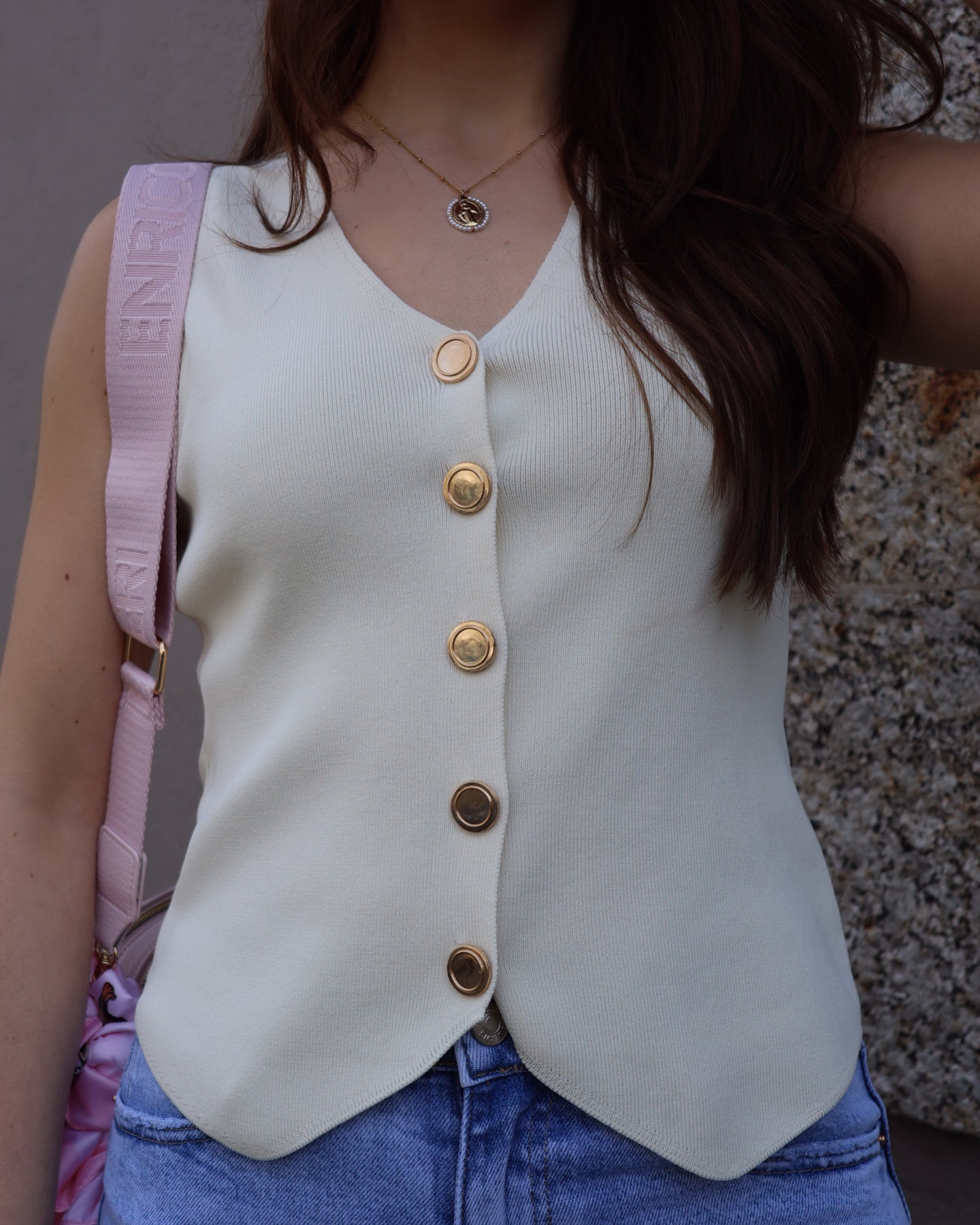 Top estilo colete com botões dourados e decote em bico. Coleção Primavera 2026.