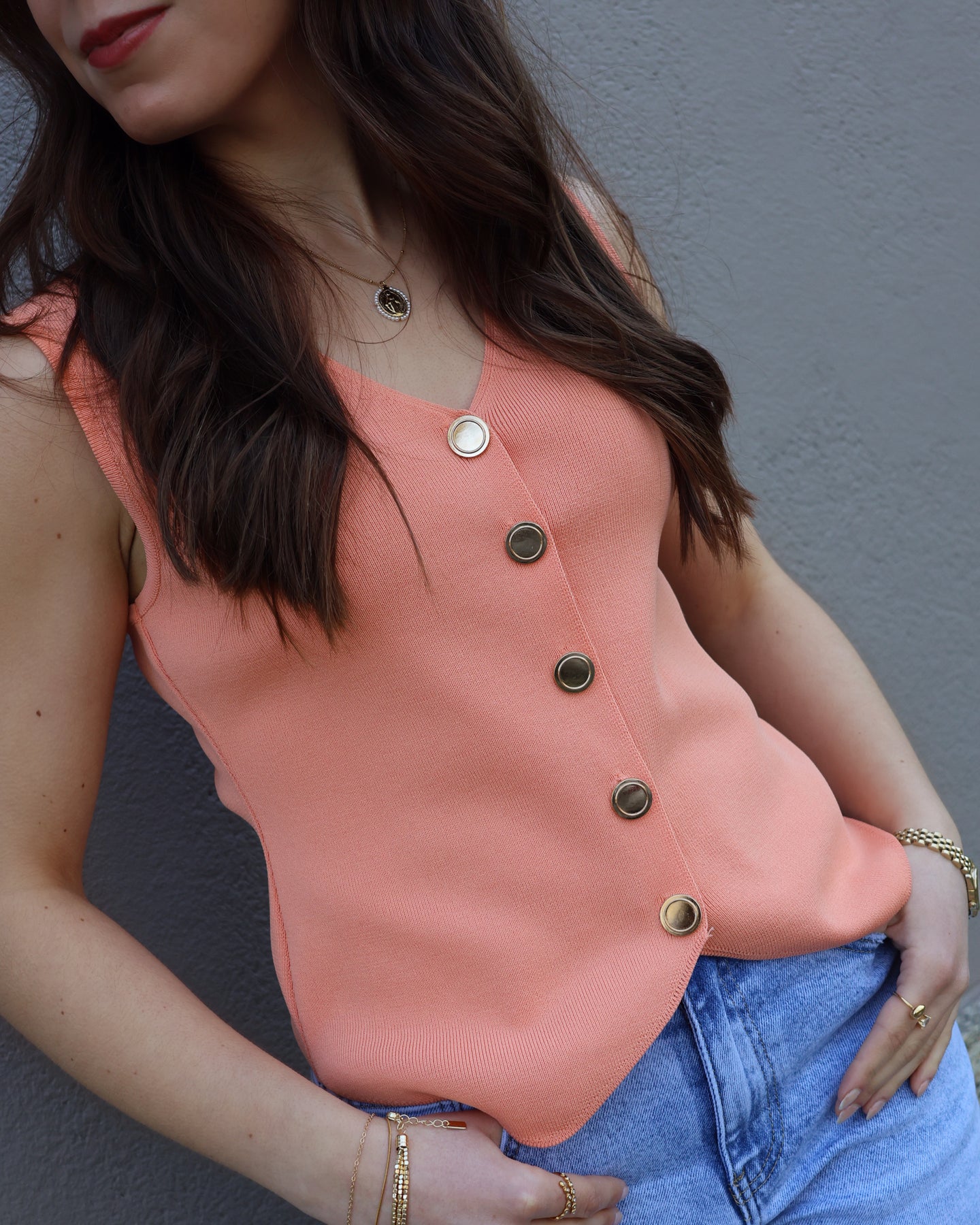Top estilo colete com botões dourados e decote em bico. Coleção Primavera 2026.