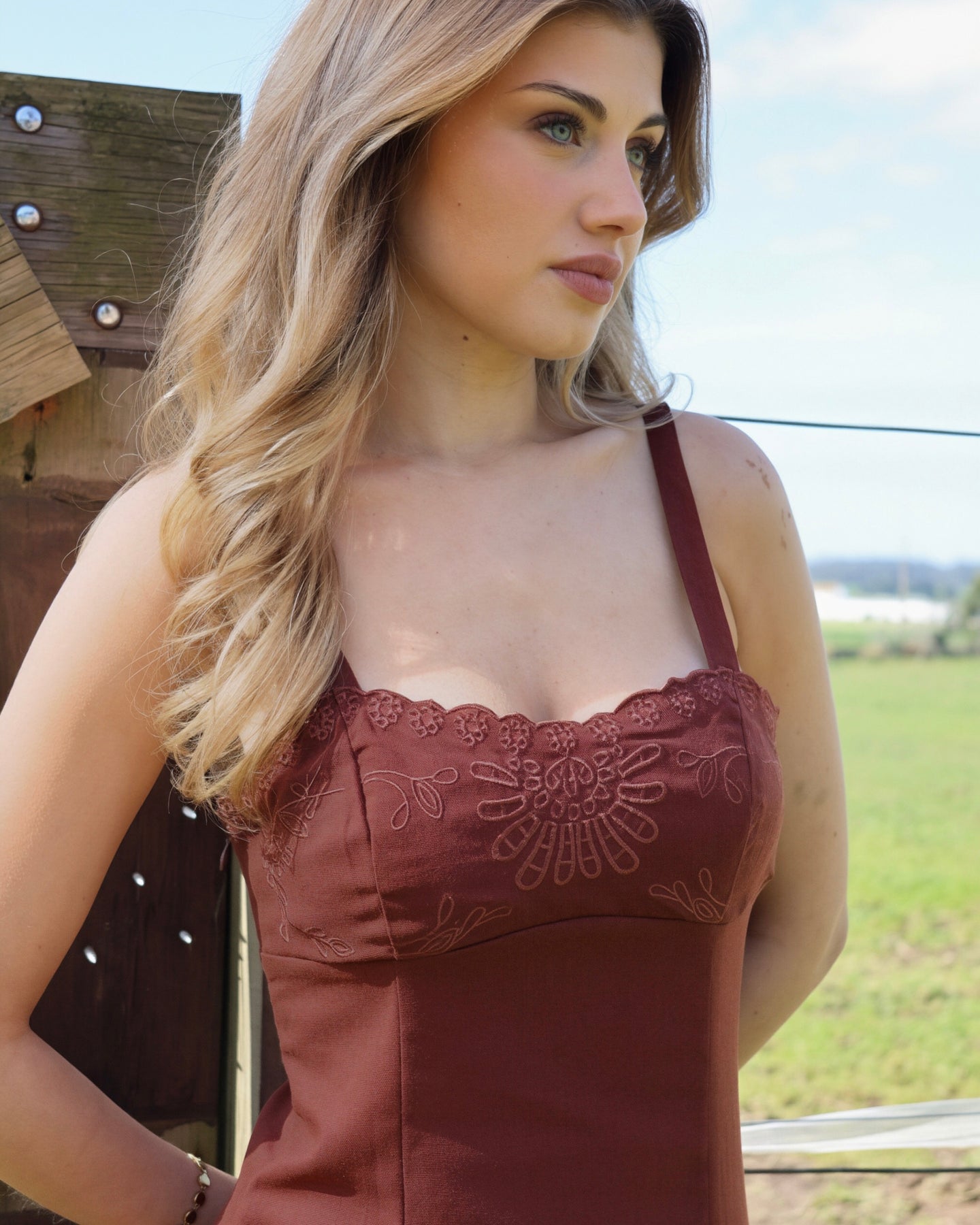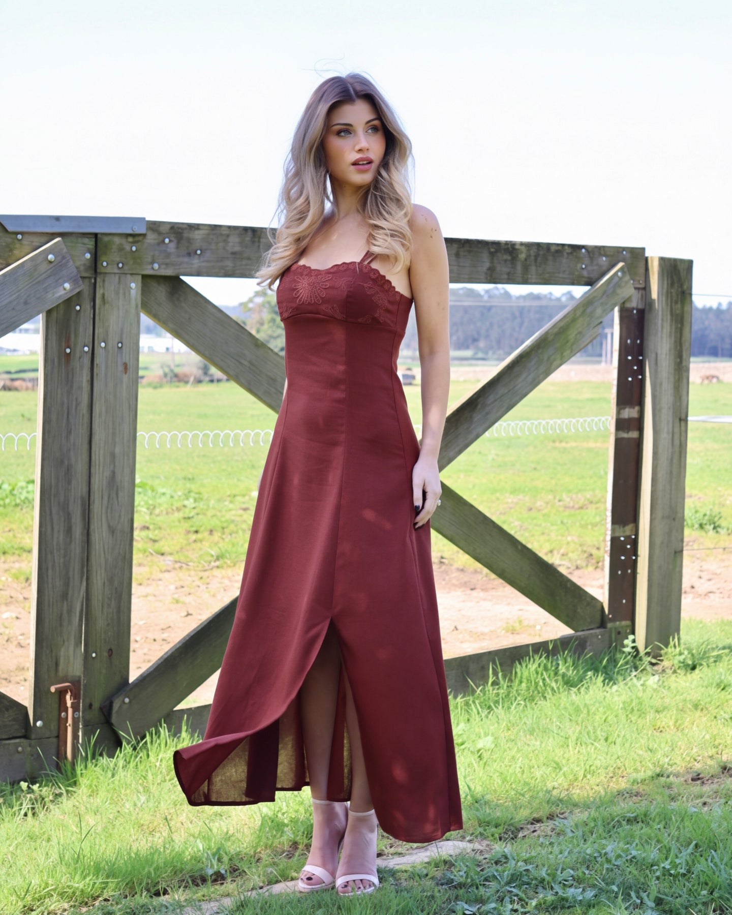 Vestido midi em linho, alças ajustáveis, fecho lateral, forrado por dentro, racha frontal lateral. Coleção Primavera 2026.
