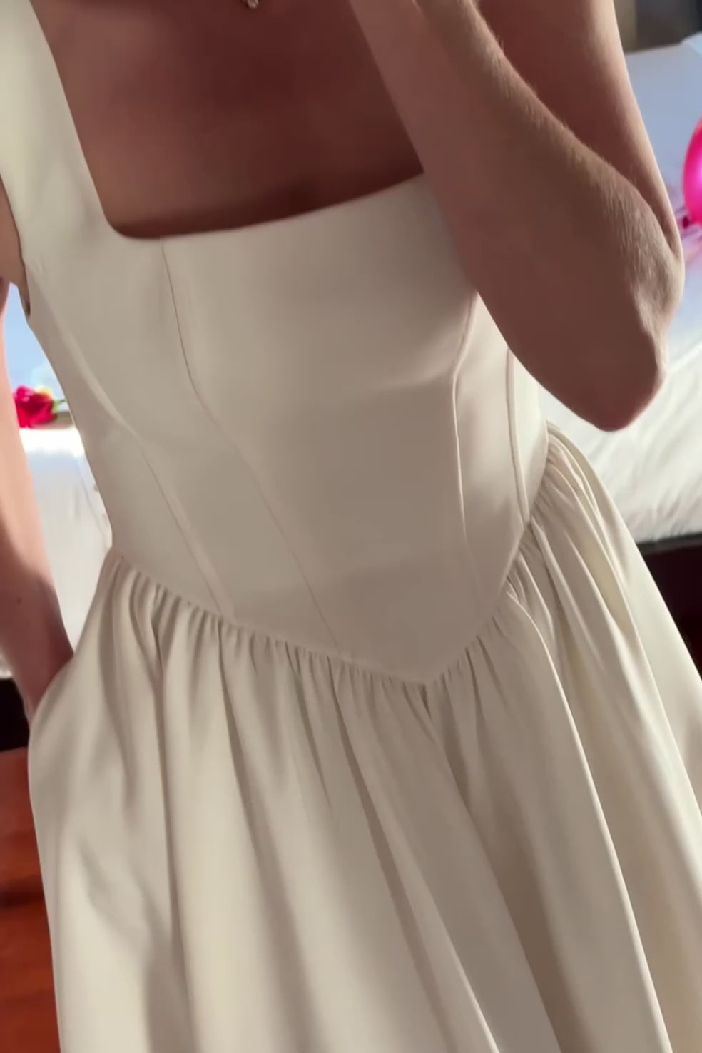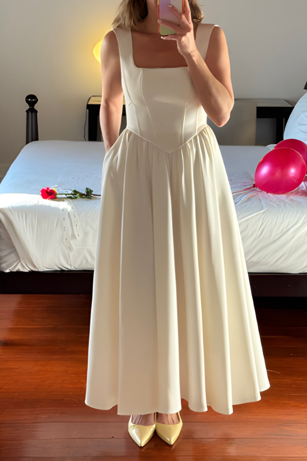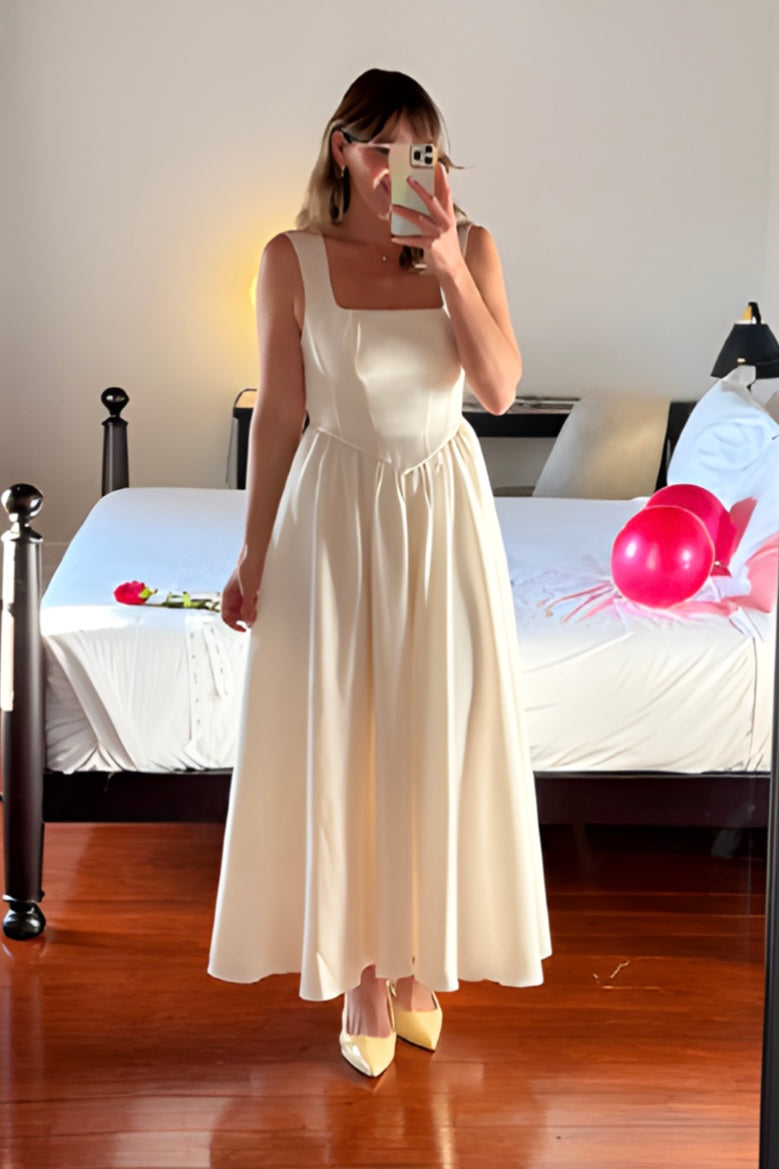 Vestido midi de alças médias, decote quadrado na frente e costas, efeito corpete/espartilho, saia evasê, tem bolsos.  Estilo romântico e elegante. O tecido caí muito bem, perfeito para eventos especiais batizados e casamentos.