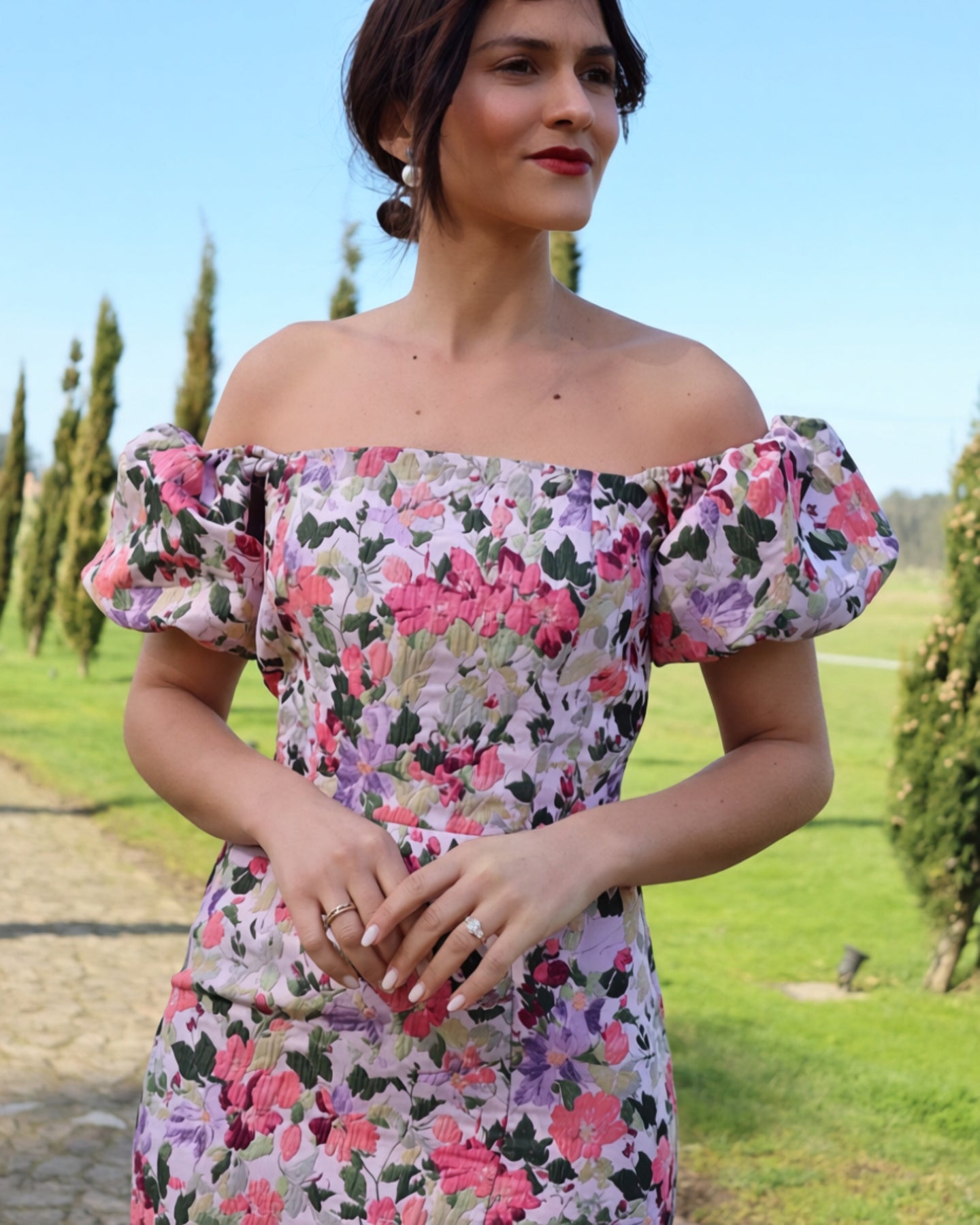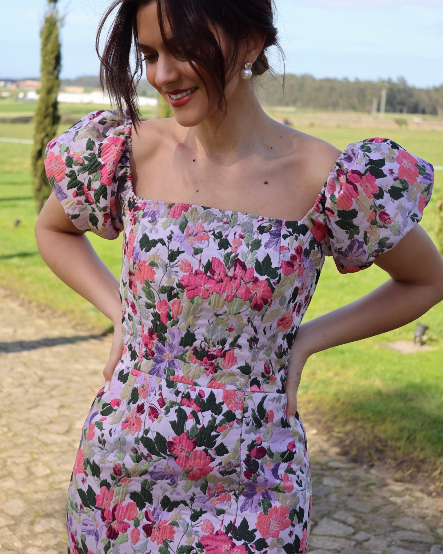 Brocade fabric dress with a straight midi skirt, balloon sleeves with elastic at the arm, square neckline, front side slit, classic silhouette with a feminine touch.
