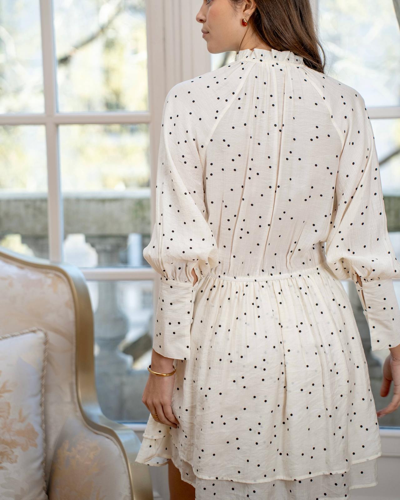 Vestido com estampado, manga comprida balão, cintura marcada, estilo romântico e elegante, Coleção Primavera 2026.