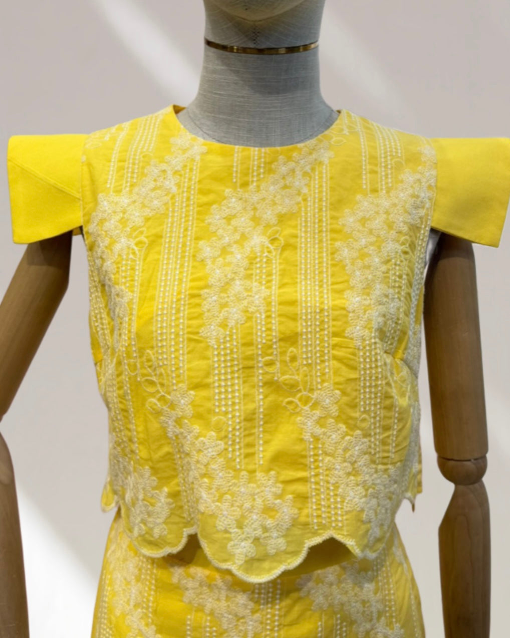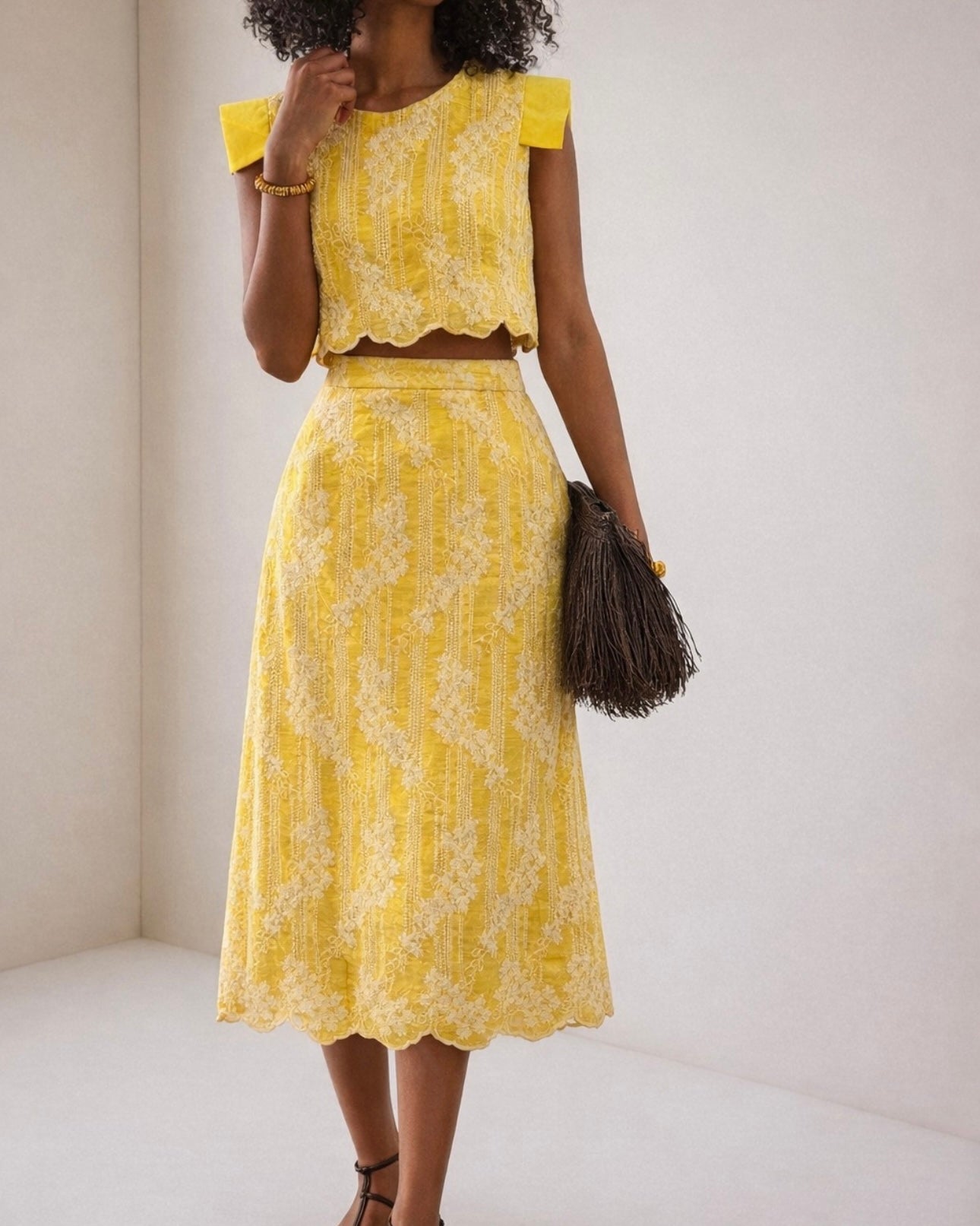 Conjunto top e saia em algodão com bordados Coleção Primavera 2026.