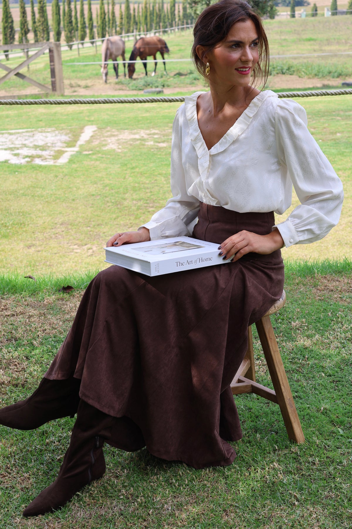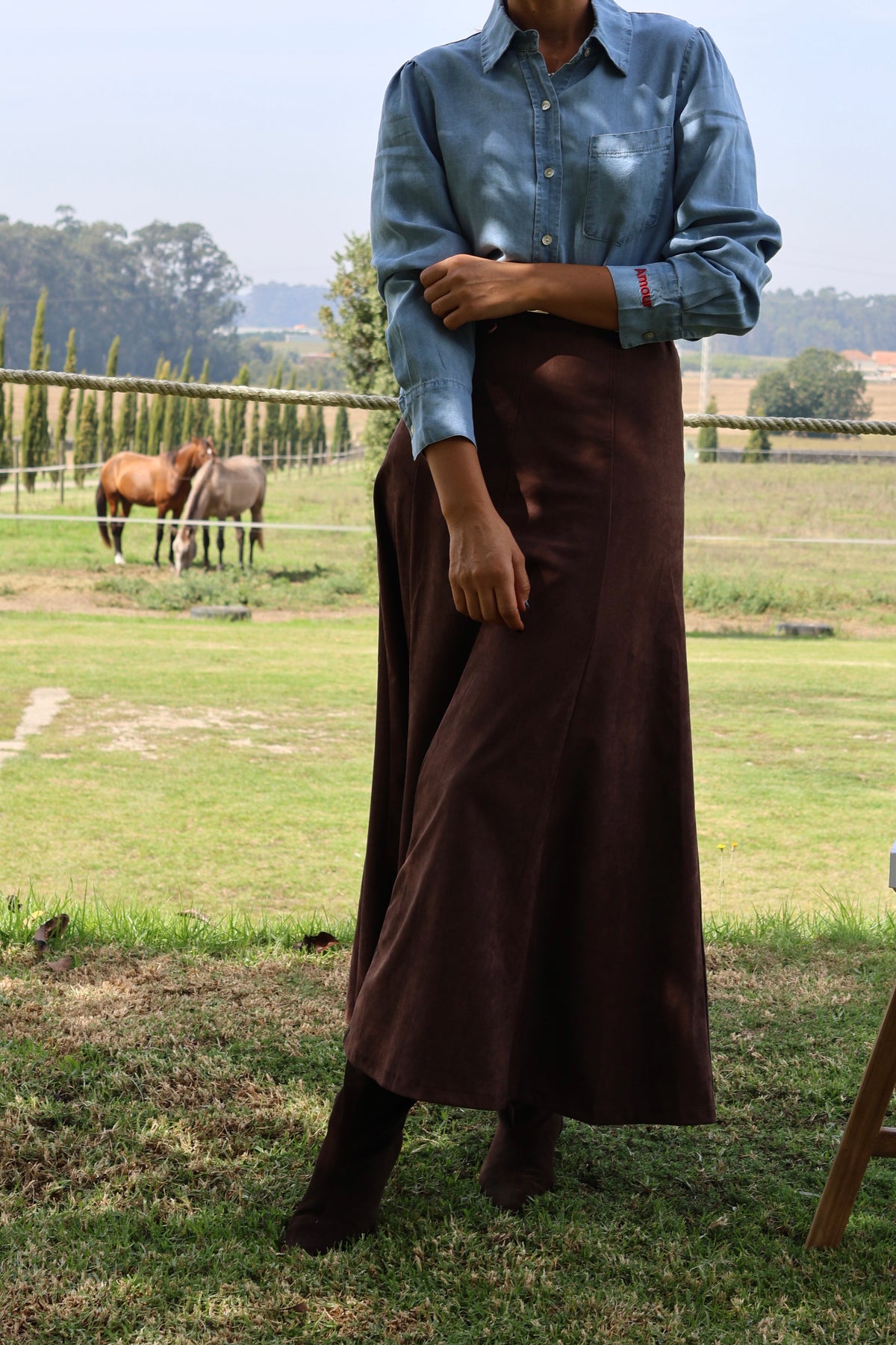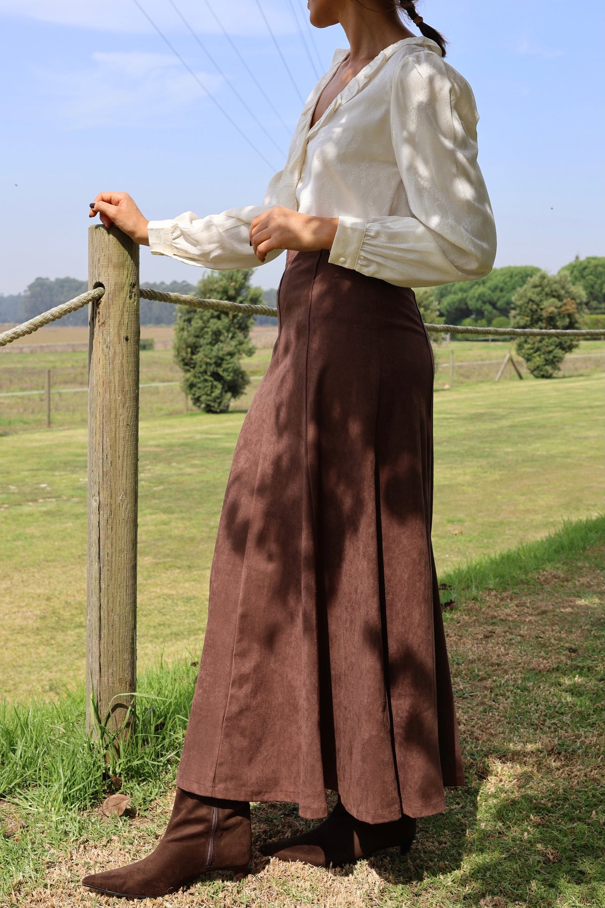 Saia midi em pele pêssego com efeito evasê, Fall-Winter 2025.
