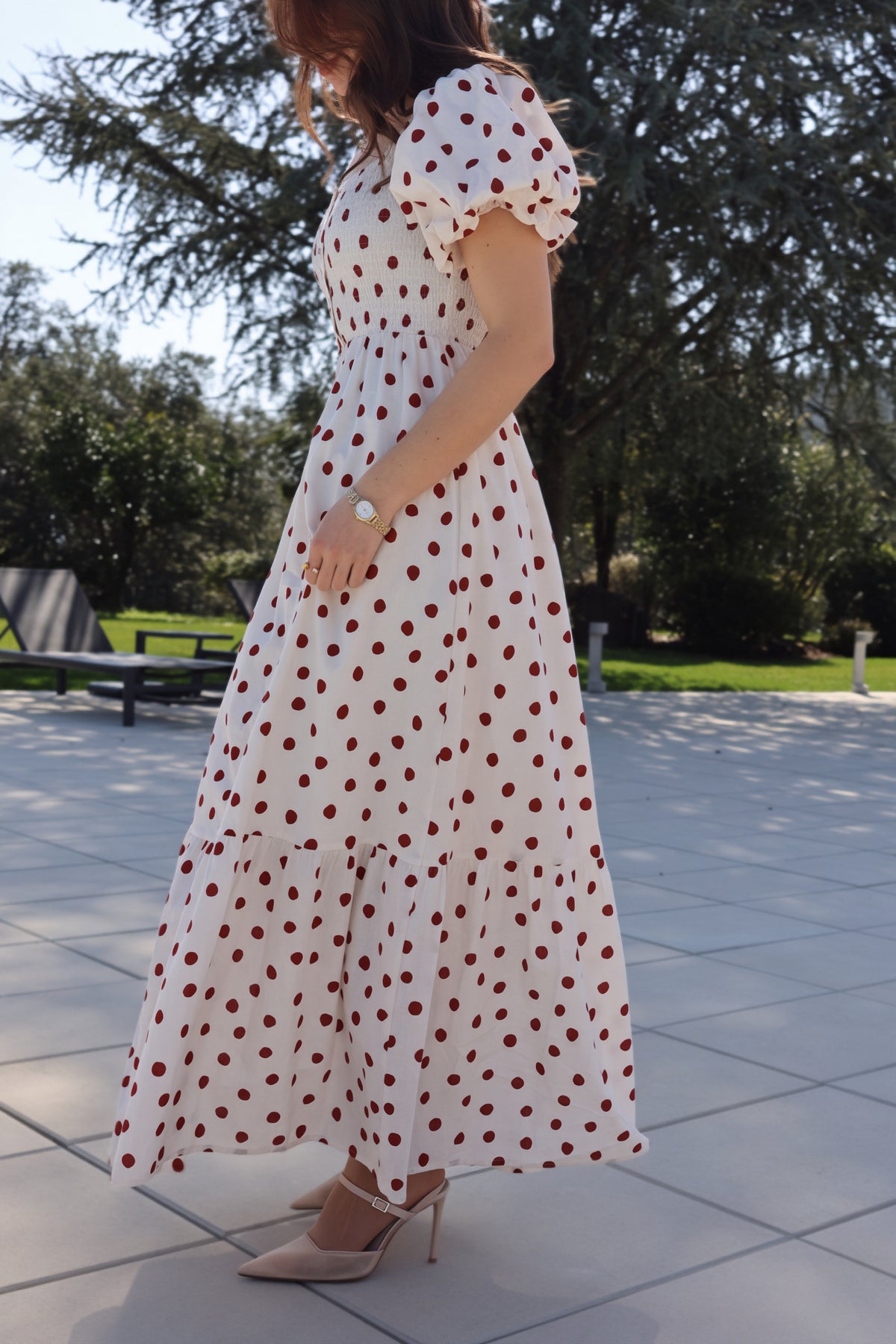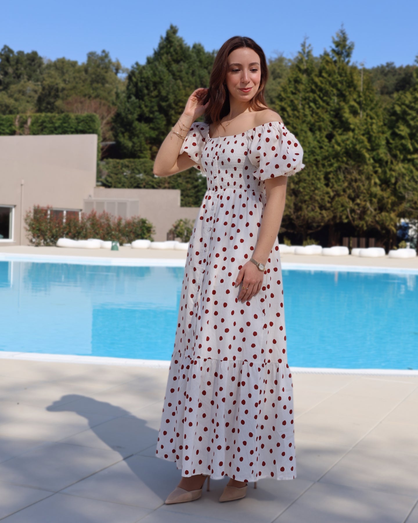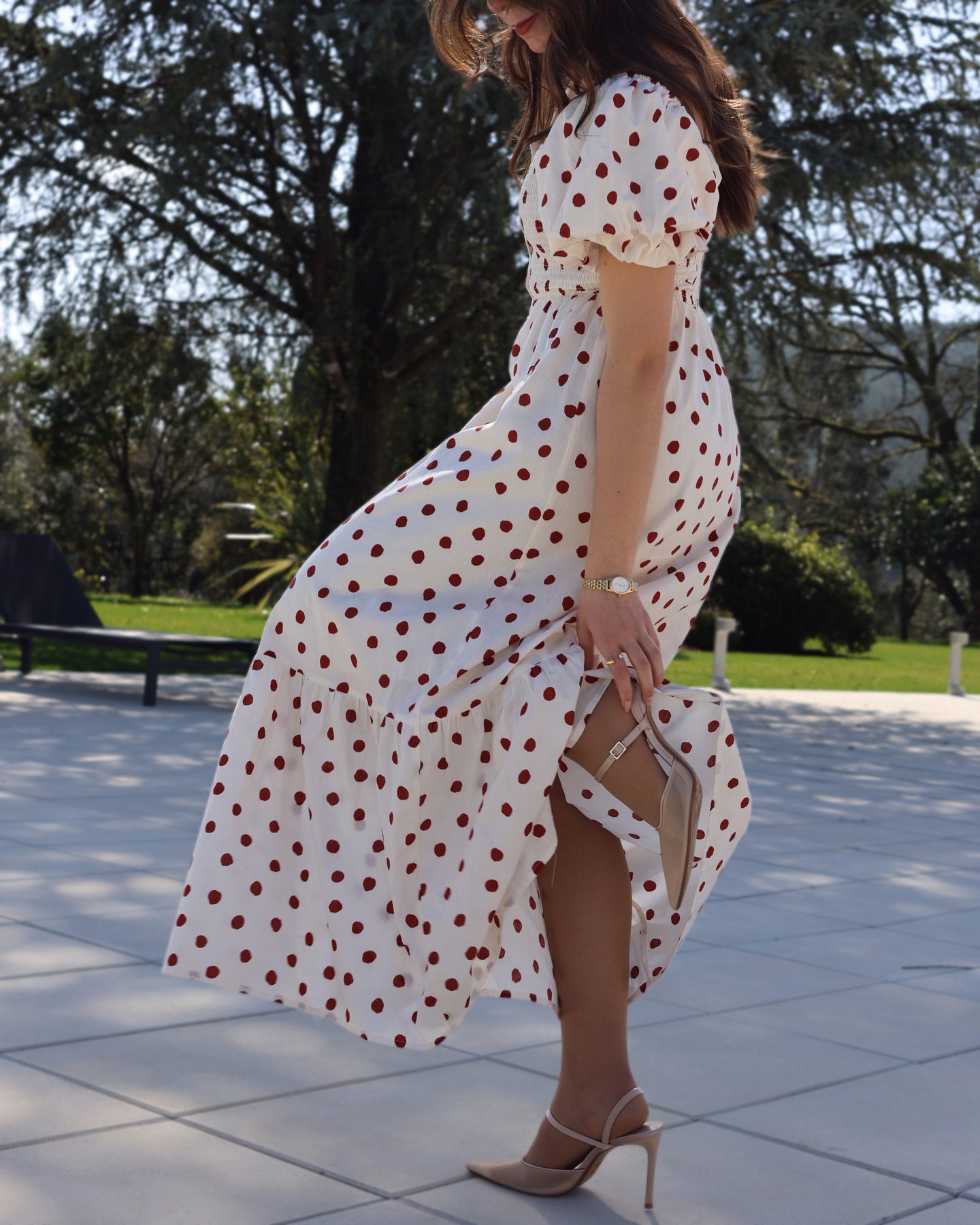 Dress with print, long balloon sleeves, defined waist, romantic and elegant style, Spring 2026 Collection.