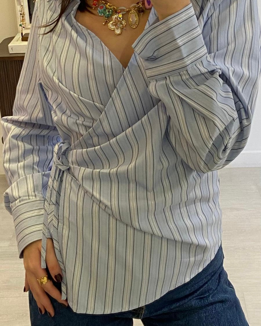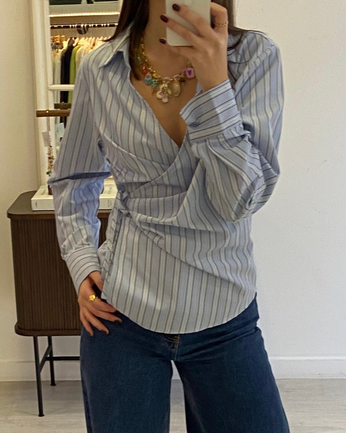 Camisa em trepasse, com listas azuis/brancas, Coleção Primavera 2026.