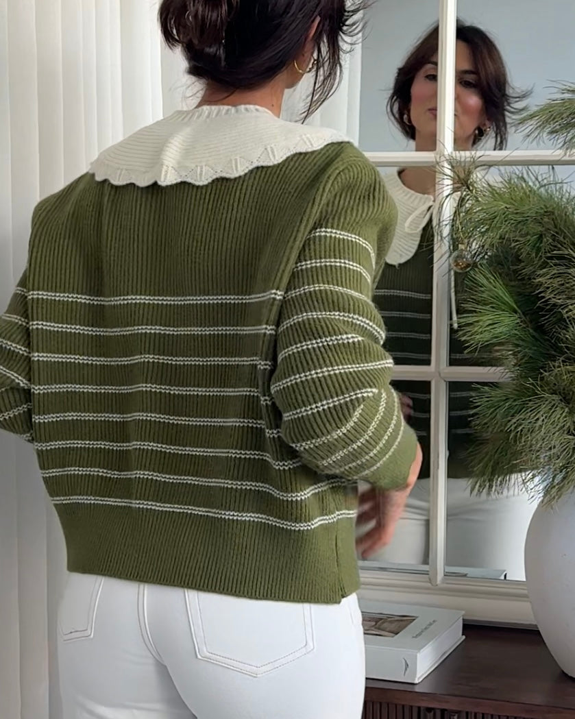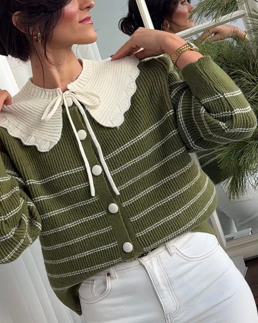 Descrição do produto. Casaco manga comprida, em malha, com listas horizontais finas, gola removível, botões forrados, Coleção Fall-Winter25.