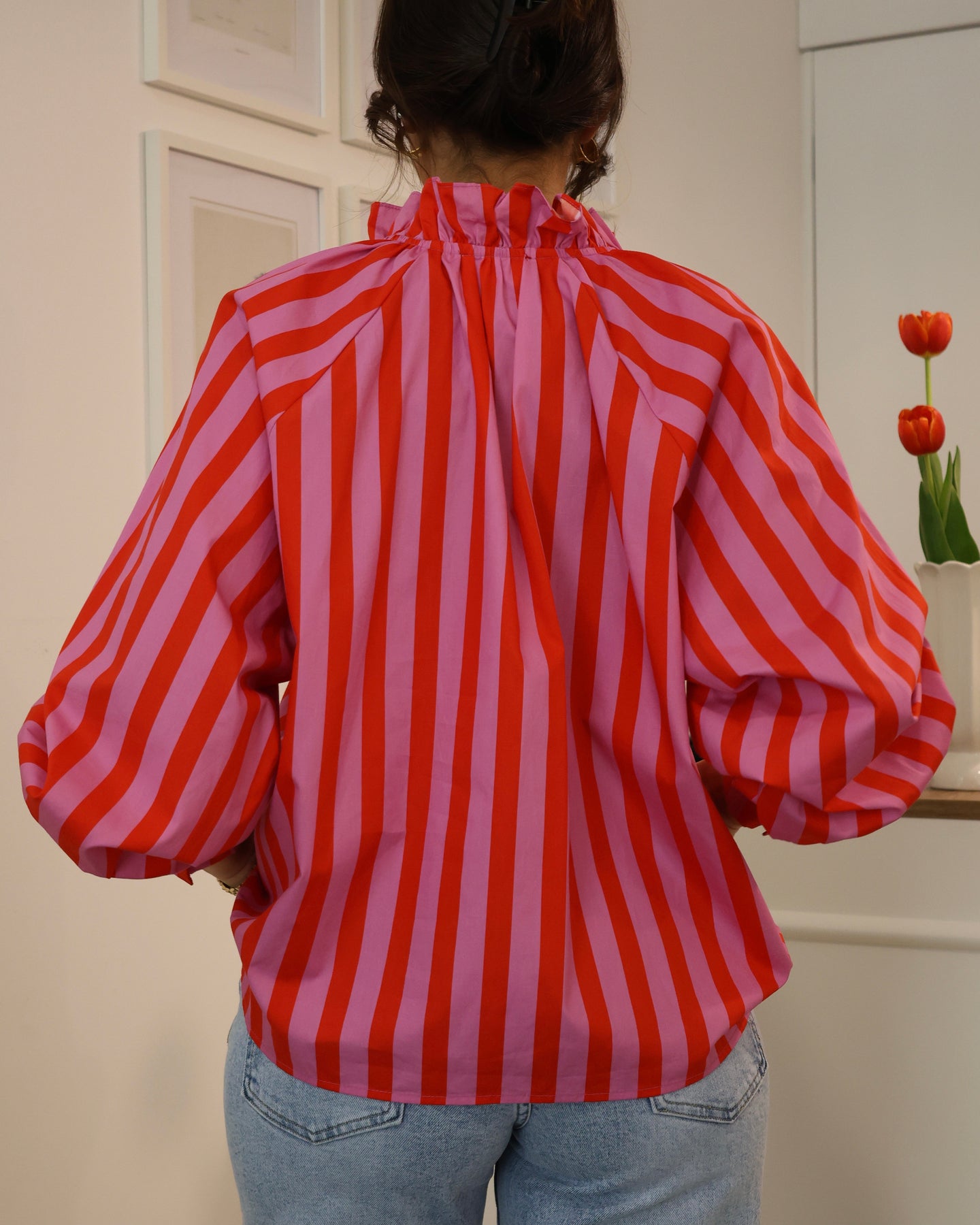 Camisa cruzada de rayas azules y blancas. Colección Primavera 2026.