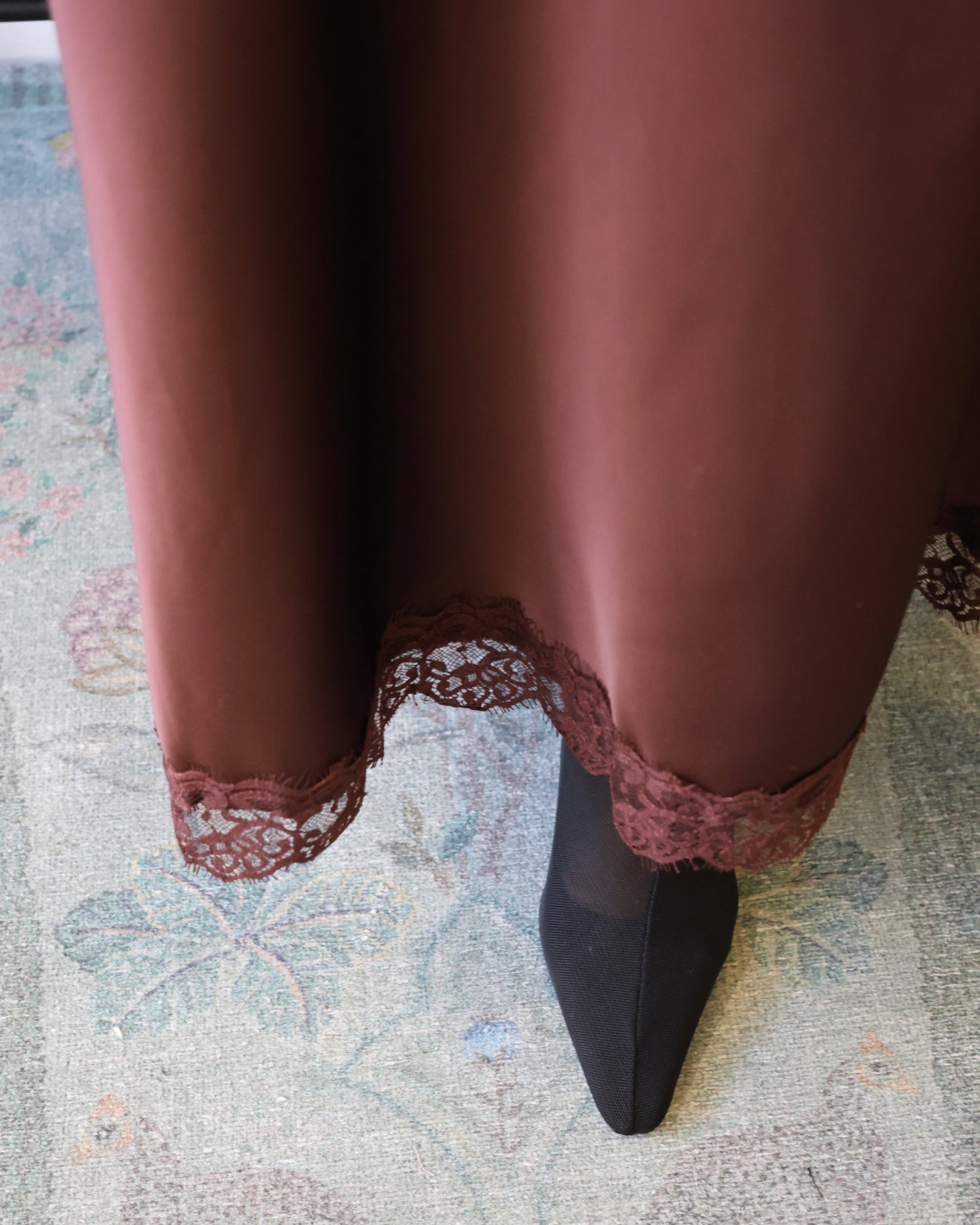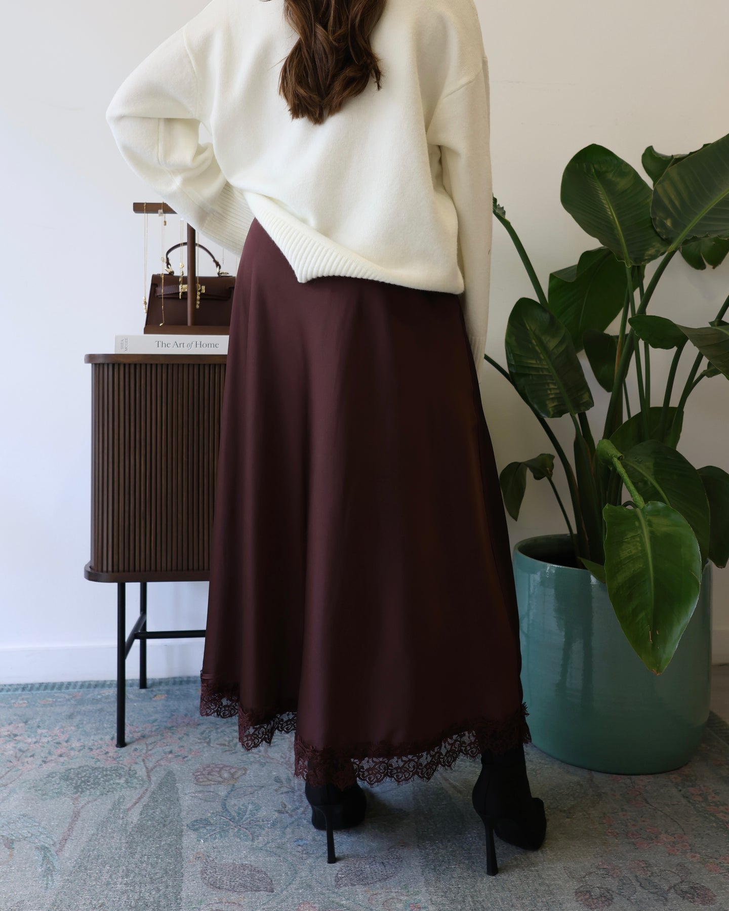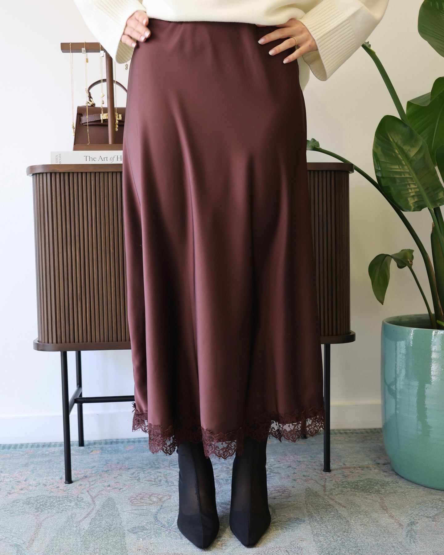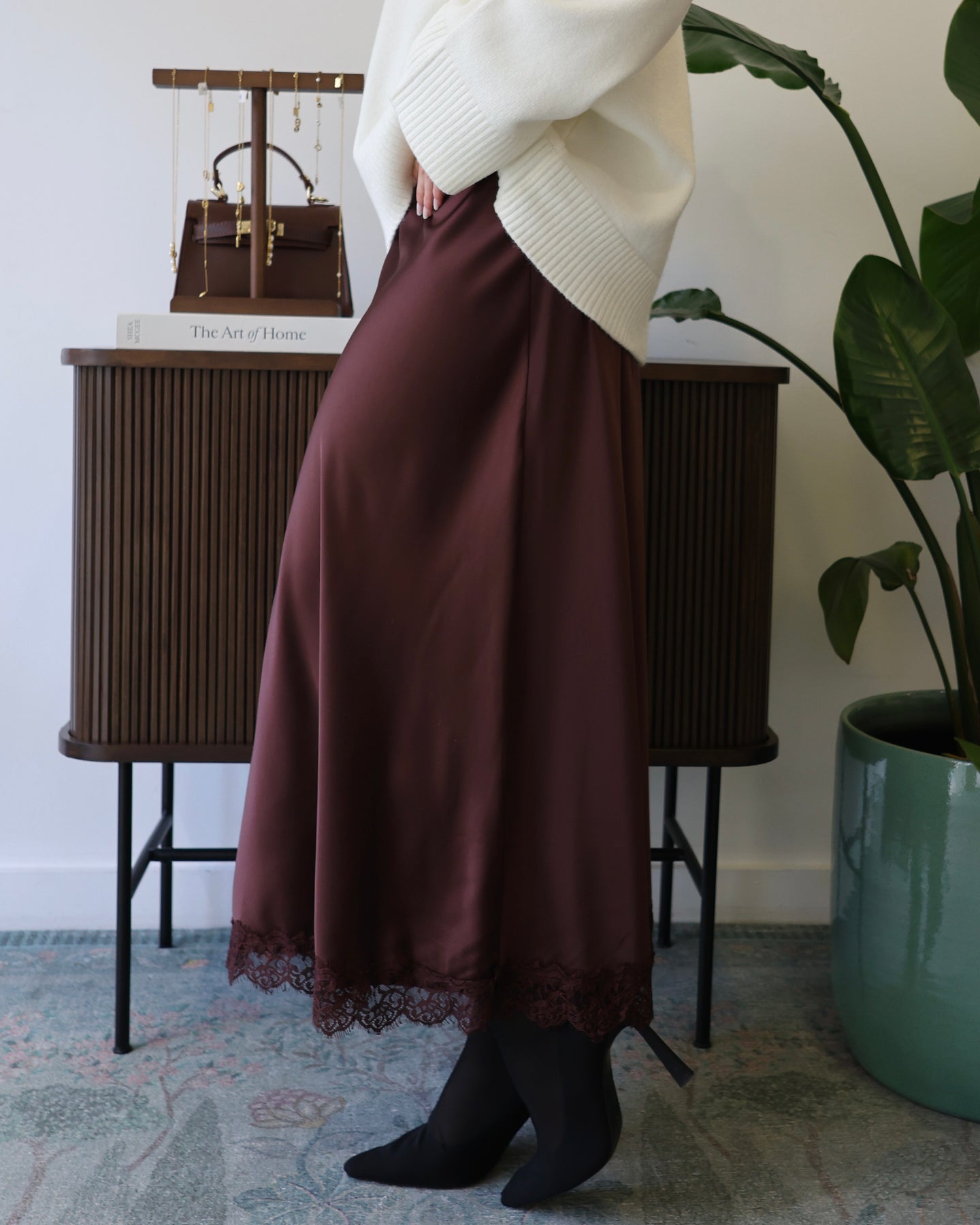 Saia midi em cetim, com elástico na cintura e detalhes em renda na bainha, Coleção Fall-Winter25.