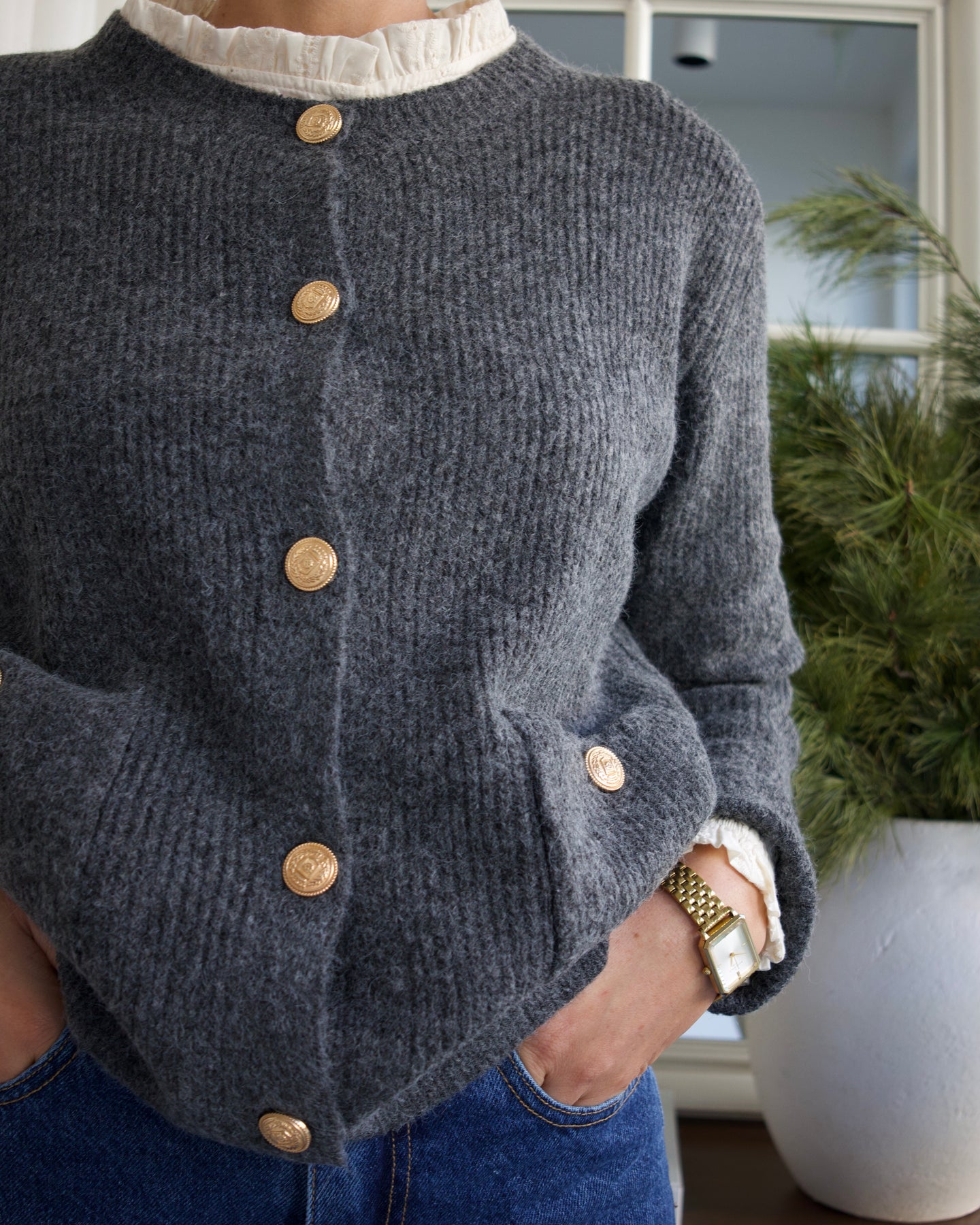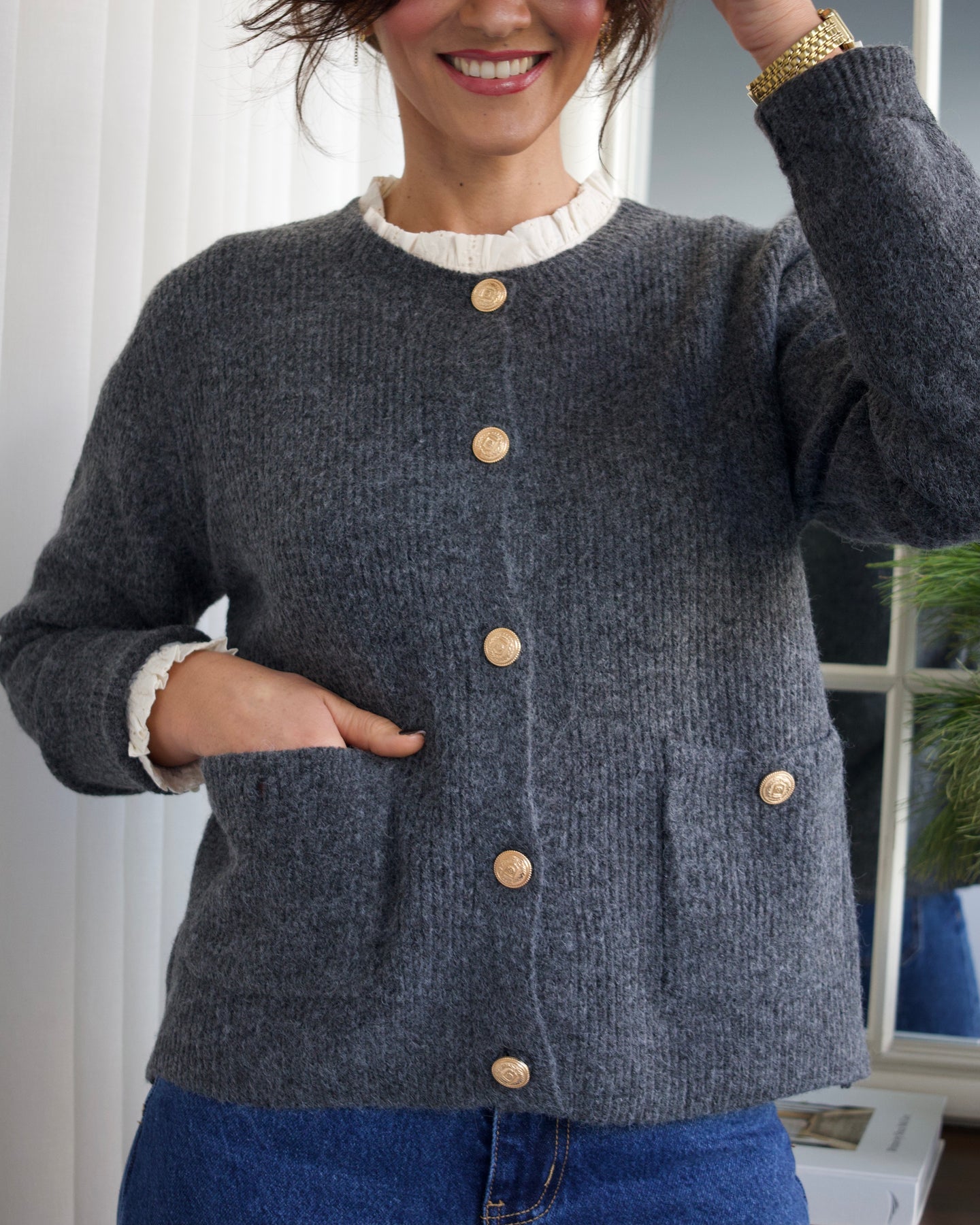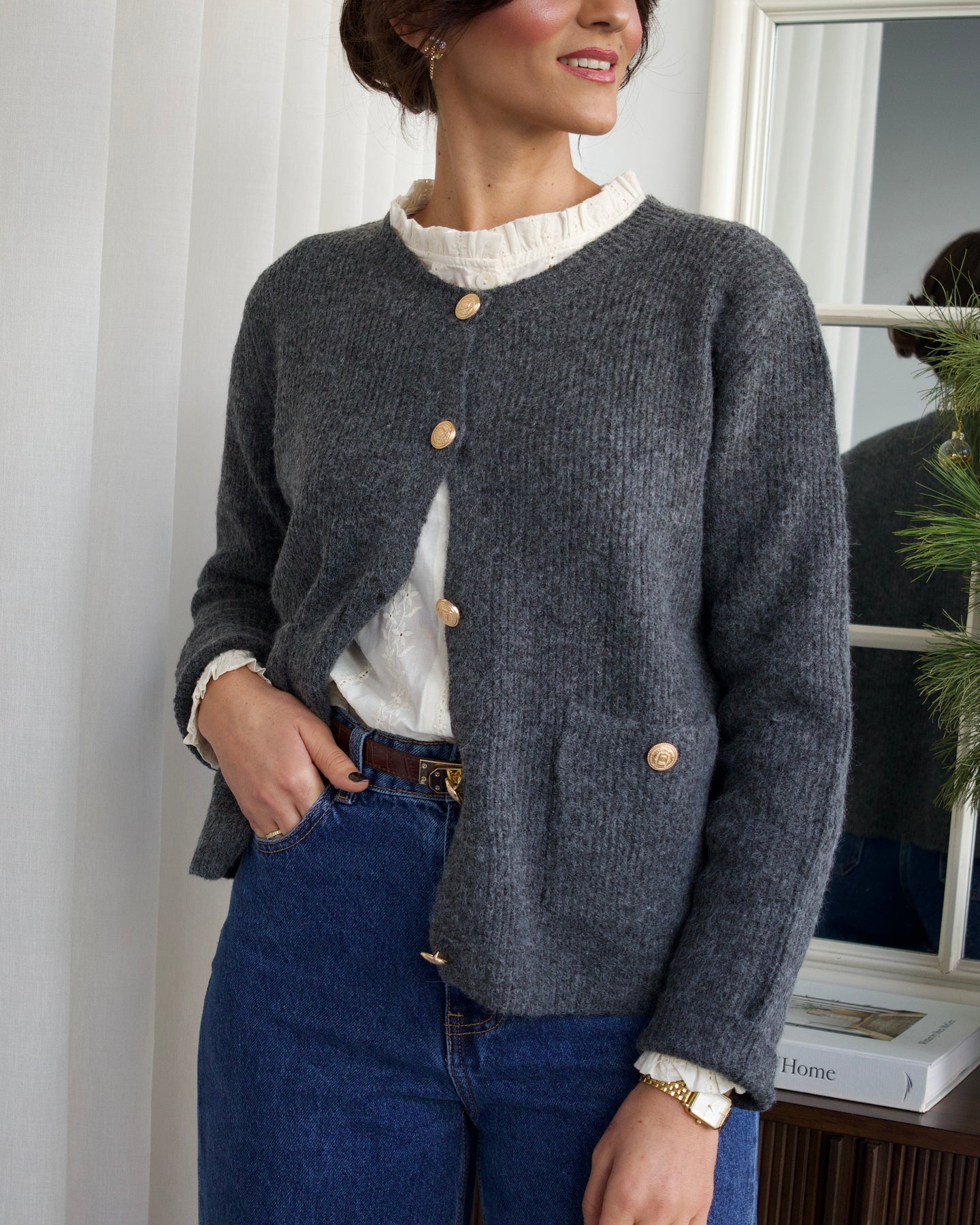 Casaco em malha com dois bolsos frontais e botões dourados. Nova Coleção Spring26.