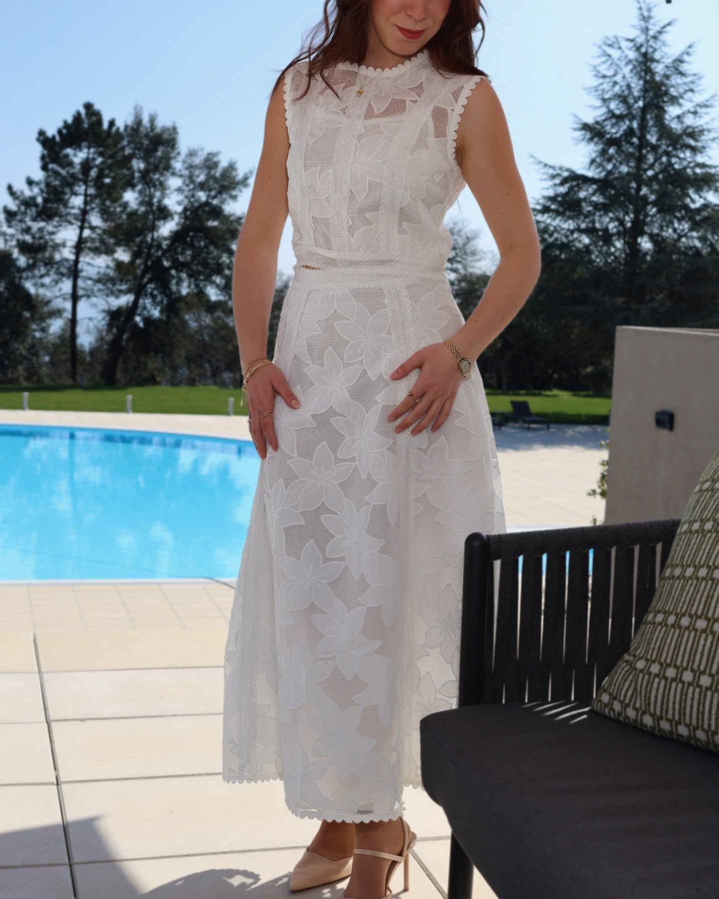 Conjunto de encaje con flores bordadas, top con cremallera trasera y falda midi, forrado en el interior. Colección Primavera 2026.