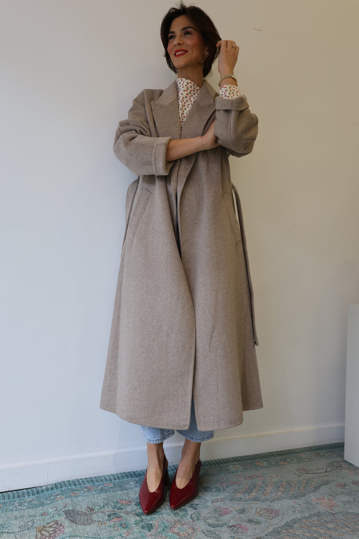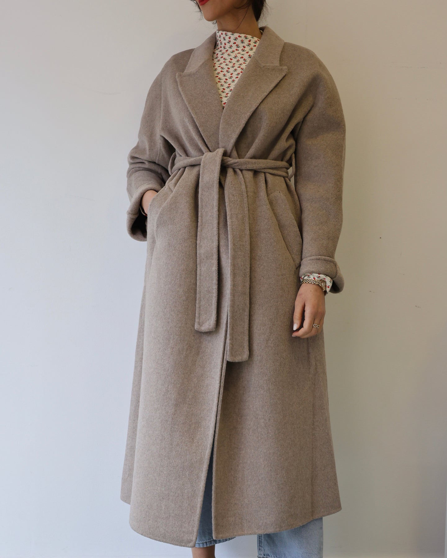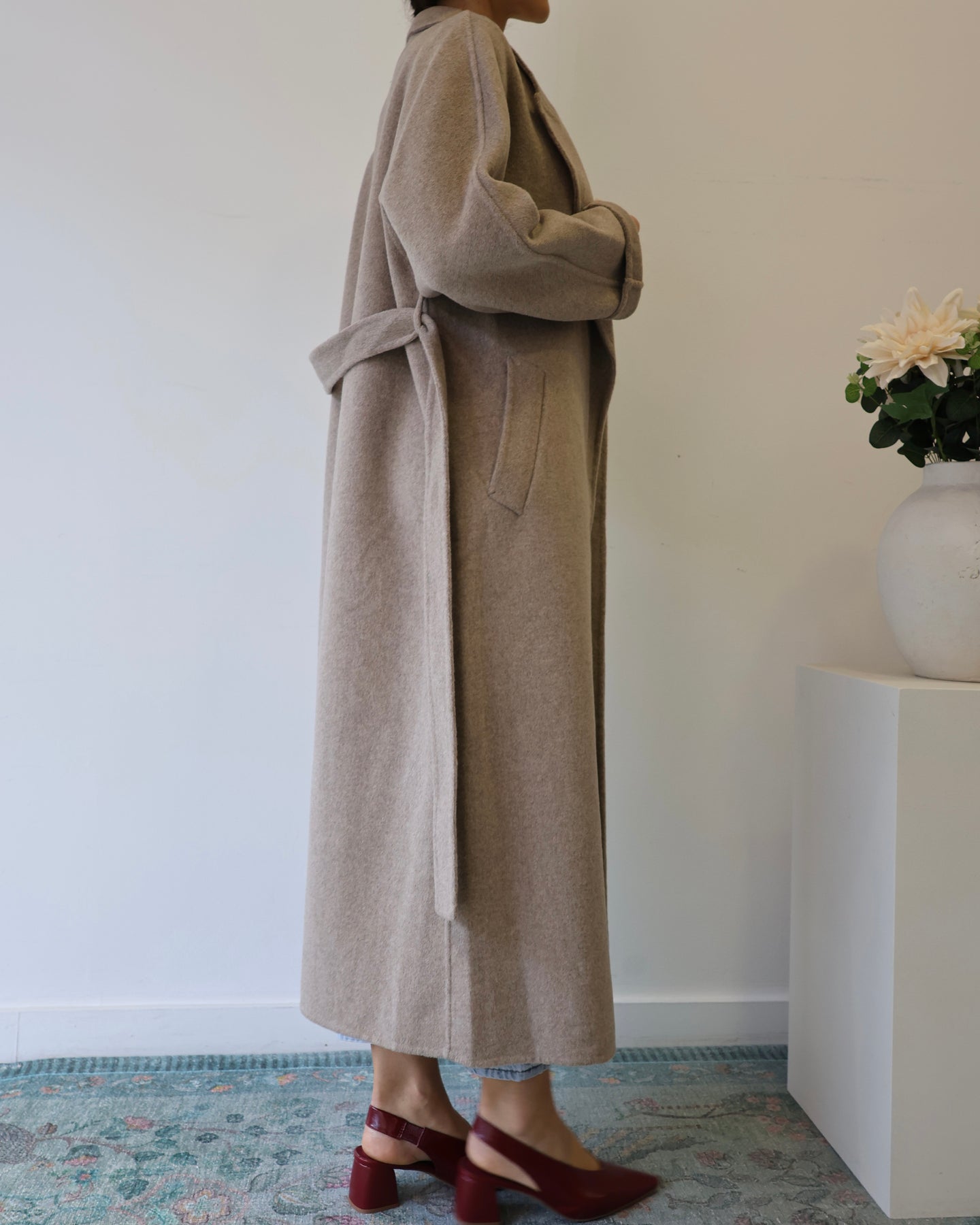 Casaco longo, corte amplo, cinto ajustável, composto por lã, racha atrás e bolsos laterais, Coleção Primavera 2026.
