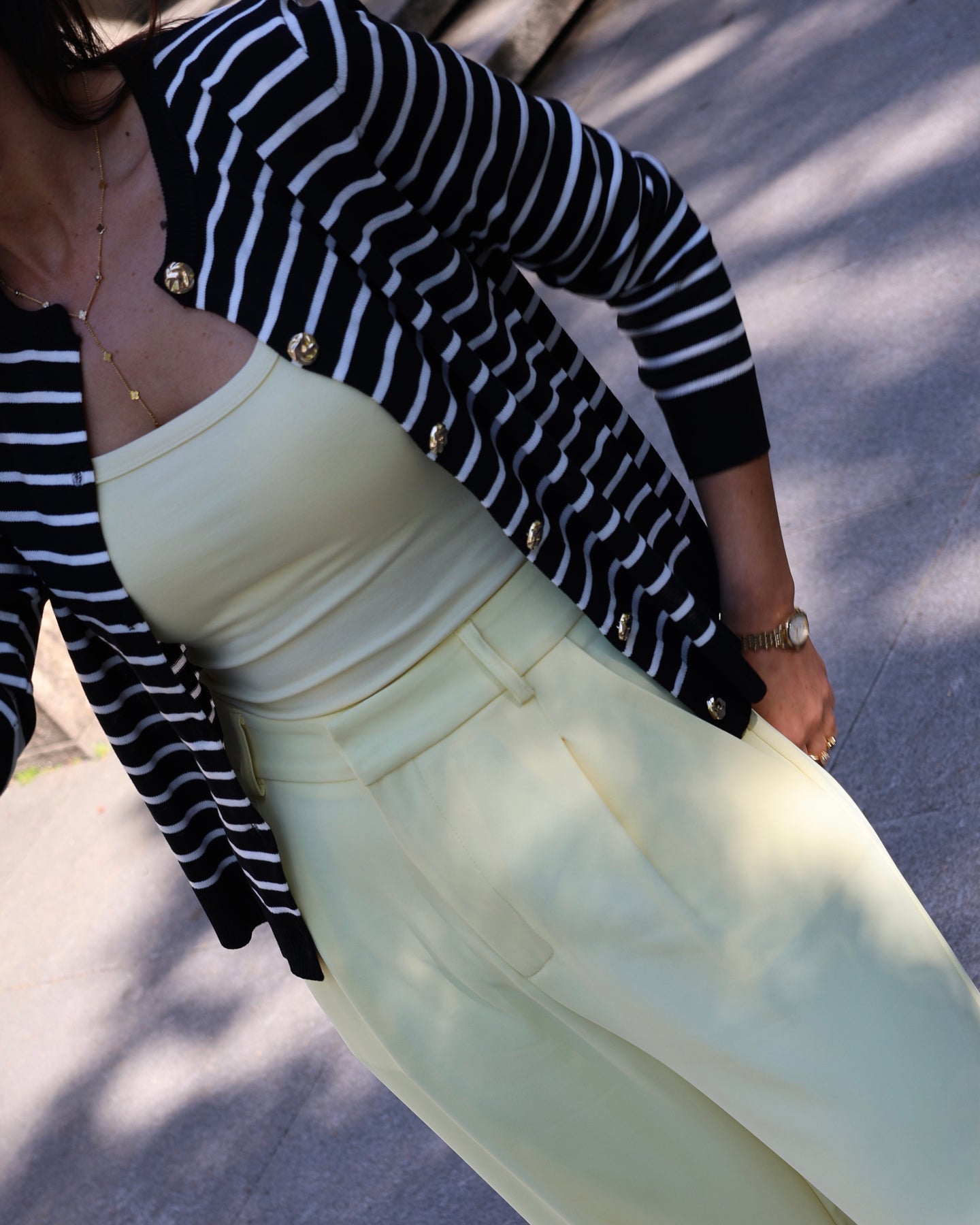 Casaco em malha de manga comprida, com listas brancas e botões dourados. Coleção Primavera 2026.