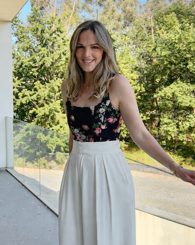 Top estilo corpete, padrão floral botânico, elástico molda el nas costas, modelo com o M. Coleção Primavera 2026.