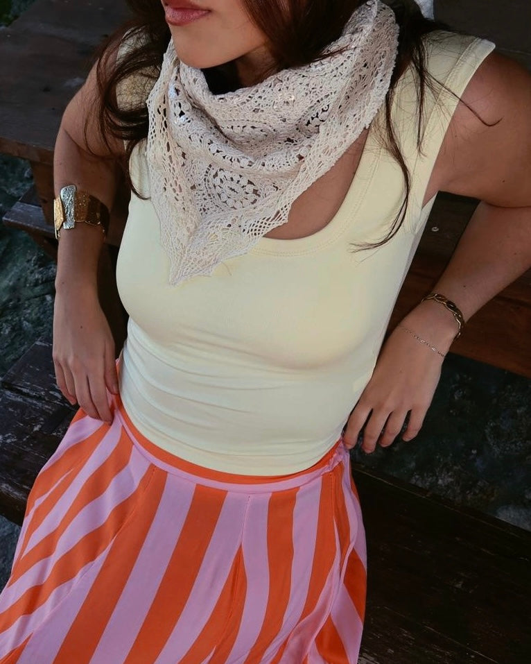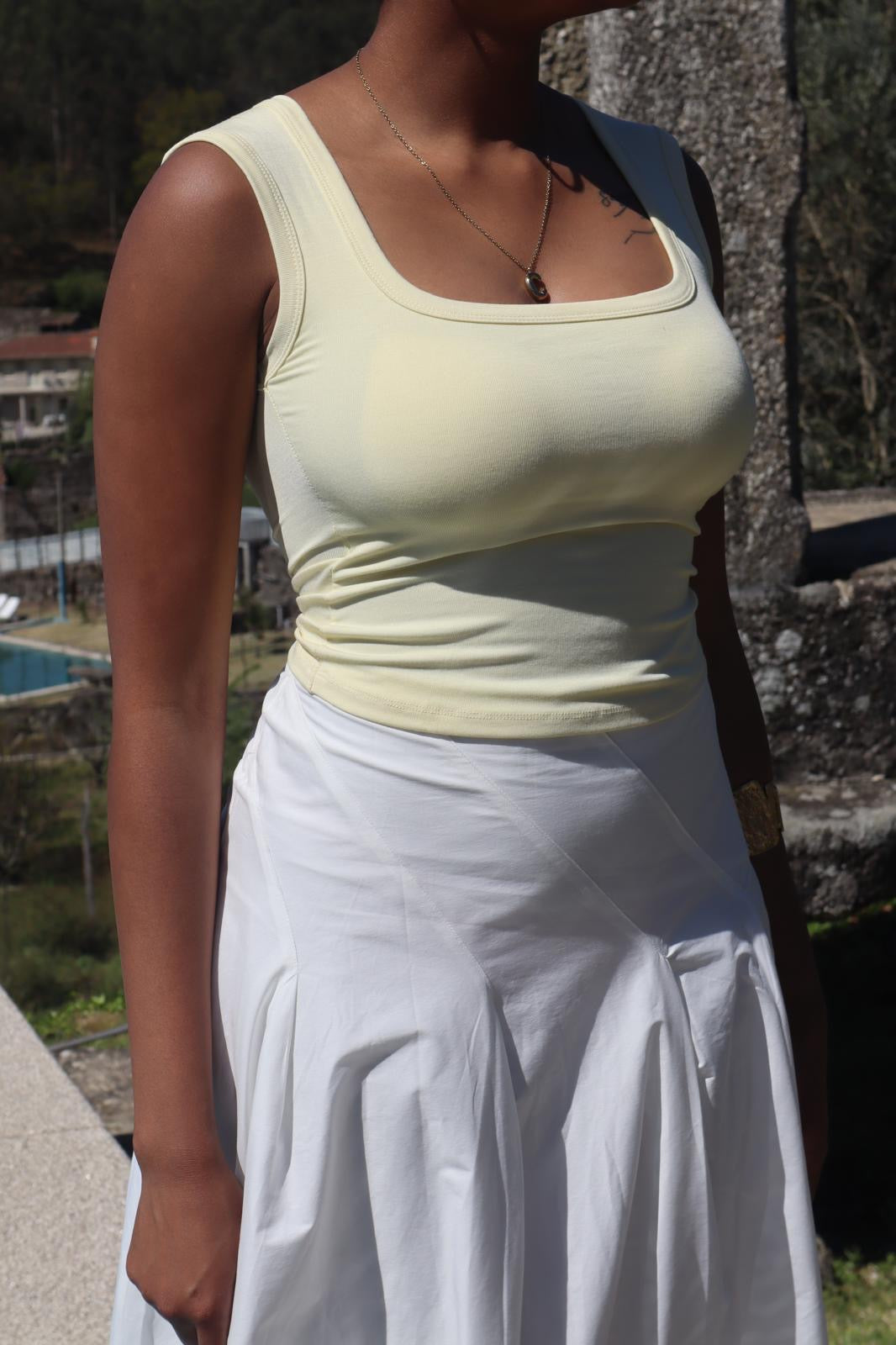 Top básico em algodão, manga curta e copa inserida.  Coleção Primavera 2026.