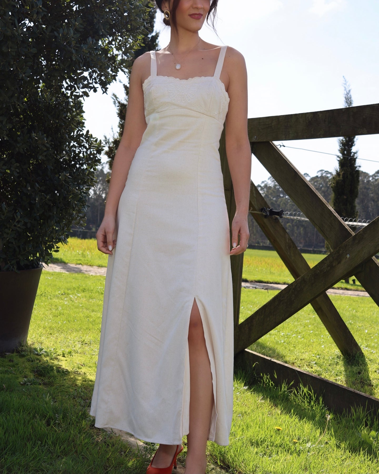 Vestido midi em linho, alças ajustáveis, fecho lateral, forrado por dentro, racha frontal lateral. Coleção Primavera 2026.