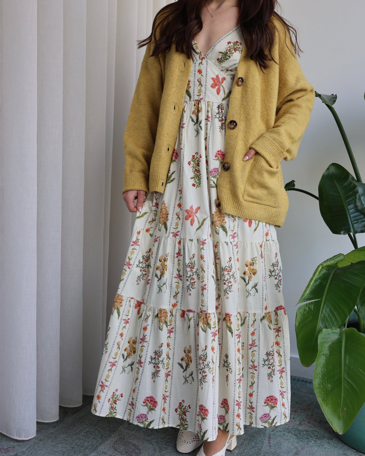 Vestido midi de alças, decote em V, padrão floral, tecido leve e fluído. Coleção Primavera 2026.